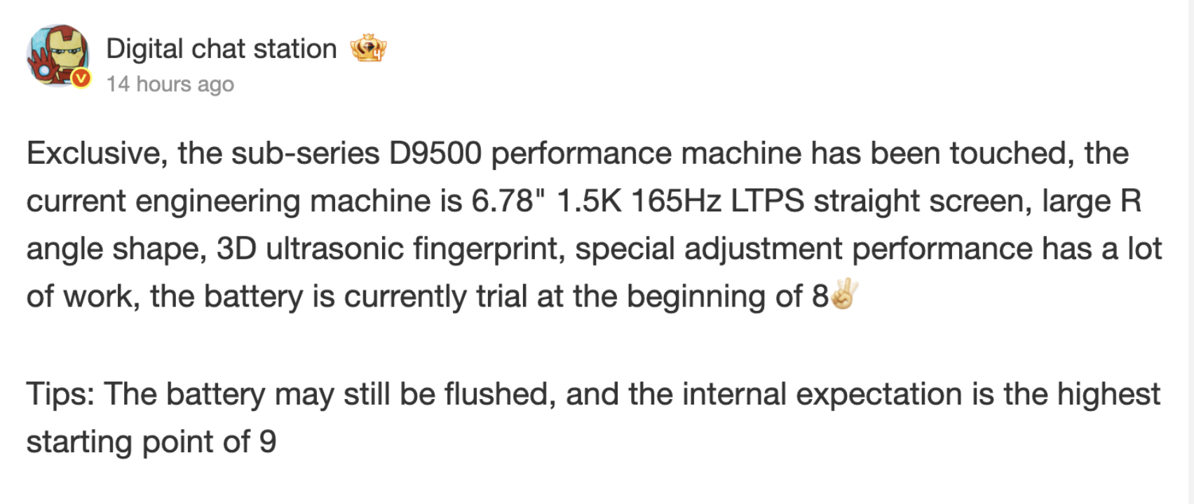Szokás szerint a kiszivárogtató nem nevezte meg közvetlenül a készüléket. A jelenlegi gondolkodás azonban arra enged következtetni, hogy a Digital Chat Station inkább a pletykált Ace 6 Ultra-ra utal, mint a OnePlus születőben lévő Turbo sorozatának bővítésére. A megnevezést félretéve a Digital Chat Station azt állítja, hogy a OnePlus a MediaTek "teljesítményváltozatával" fejleszt okostelefont Dimensity 9500 lapkakészlettel.