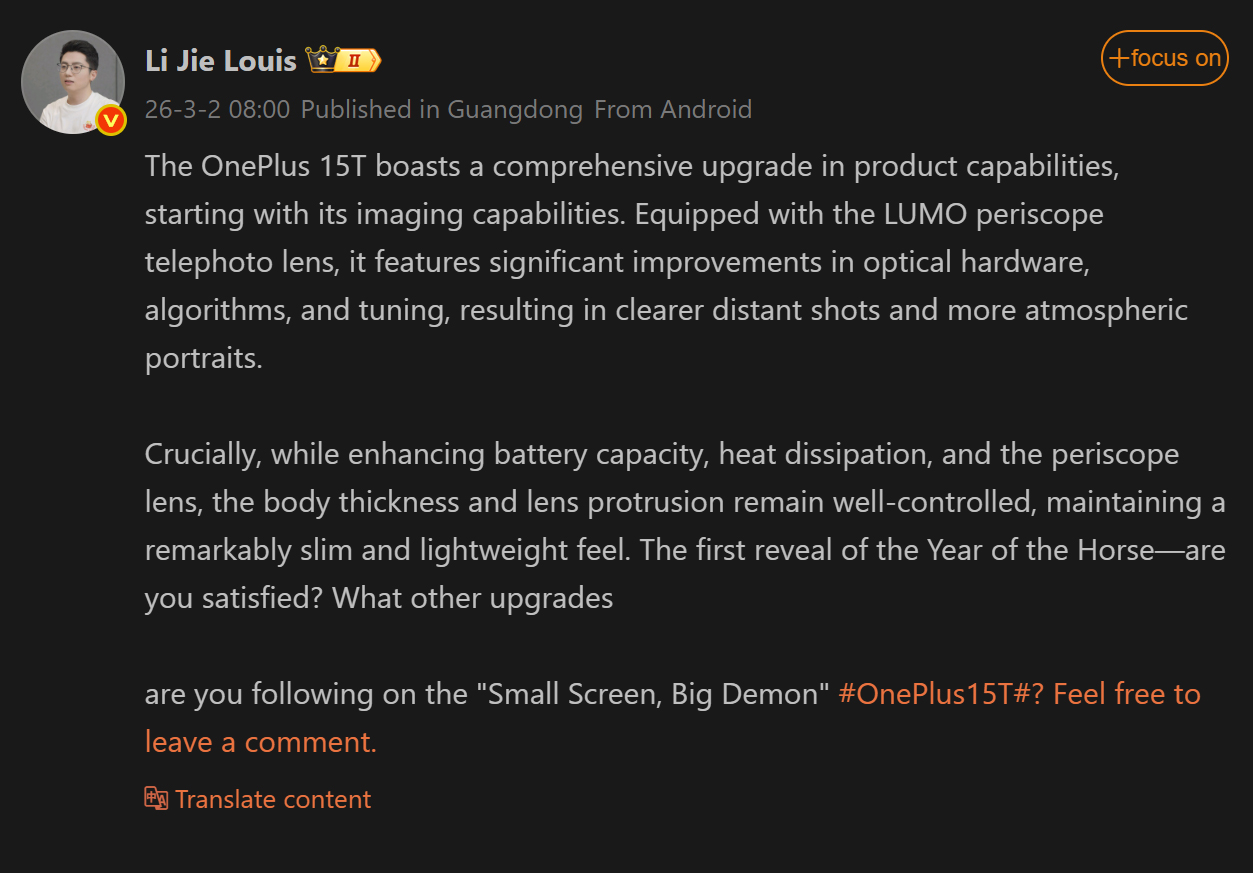 Egy nemrégiben a Weibo-n közzétett bejegyzésében Louis megosztotta, hogy a közelgő kompakt telefon a LUMO periszkóp teleobjektívvel. Az algoritmus, az optikai hardver és a tuning frissítésének köszönhetően a OnePlus 15T a hírek szerint tisztább távoli felvételeket és részletes portrékat kínál majd.