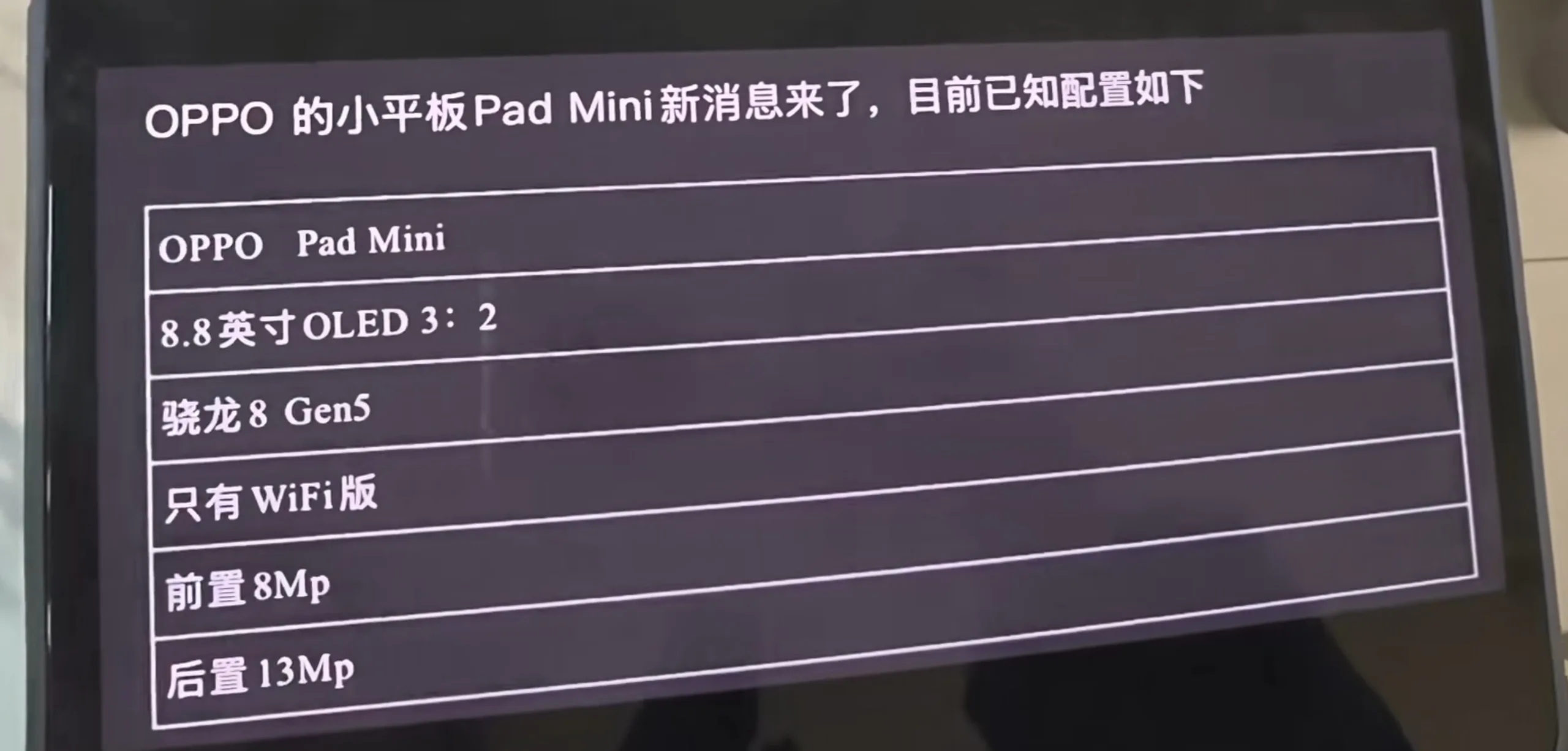 A hírek szerint egy egyedi 8,8 hüvelykes, nagy frissítési sebességű OLED kijelzővel állunk szemben, amivel máris közvetlen versenytársa a Huawei MatePad Mini.