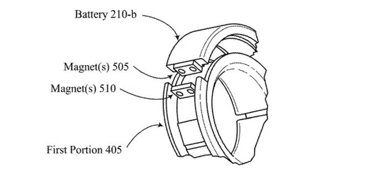 Amint az ábrák mutatják, az akkumulátor a gyűrű egyik felében található. A külső rész, amelyben az akkumulátor található, könnyen eltávolítható és szükség esetén kicserélhető. Mind az akkumulátormodul, mind a gyűrű kis mágneseket tartalmaz, amelyek az akkumulátort a helyén tartják. Fémérintkezők teszik lehetővé az áram átvitelét az akkumulátorról a gyűrűre, így a felhasználóknak nem kell apró dugókkal bíbelődniük az akkumulátor cseréjéhez.