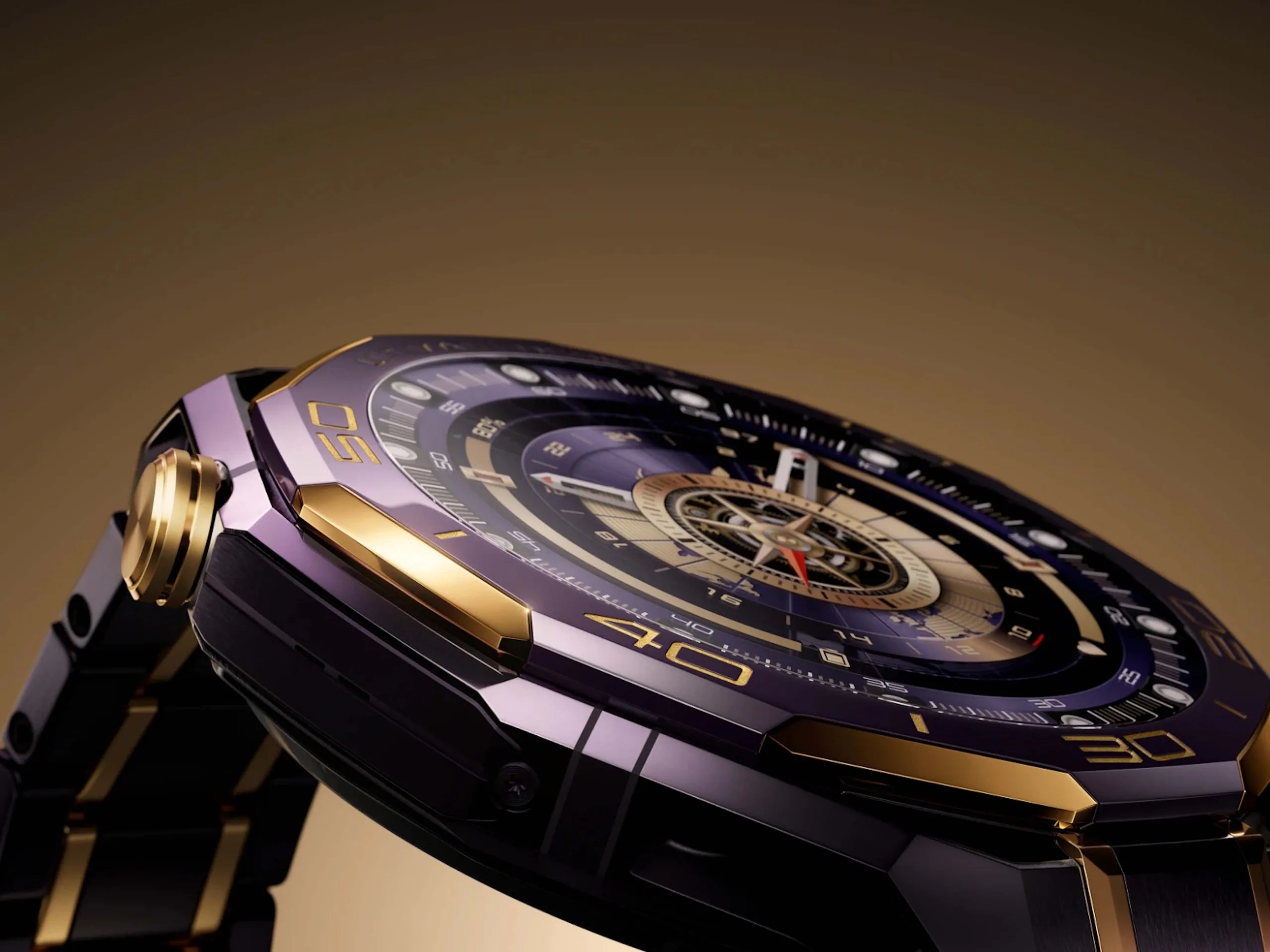 A Huawei Watch Ultimate Design Royal Gold lila és arany dizájnú, kerámia lünetta 18K és 24K arany ékezetekkel. A burkolat cirkónium alapú folyékony fémből készült, amely állítólag különösen rugalmas, és az üreges tok segít könnyebbé tenni. Az órához tartós lila és arany titánötvözetből készült szíj tartozik, az előlapot zafírüveg védi, és a korona is 18K arany bevonatú.