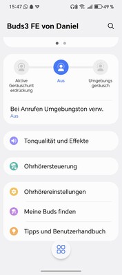 Az adaptív ANC hatékonyan, akár 30 dB-rel is csillapítja az alacsony frekvenciákat, például a közlekedési zajokat, míg a középfrekvenciákat (hangok) jelentősen csökkenti anélkül, hogy teljes csendet teremtene. Az üzemmód dinamikusan alkalmazkodik a környezethez, az Ambient Sound pedig lehetővé teszi a környezeti hangok természetes áthallását minimális sziszegéssel csendes területeken. A Buds3 FE repülőgépen is jól teljesített.