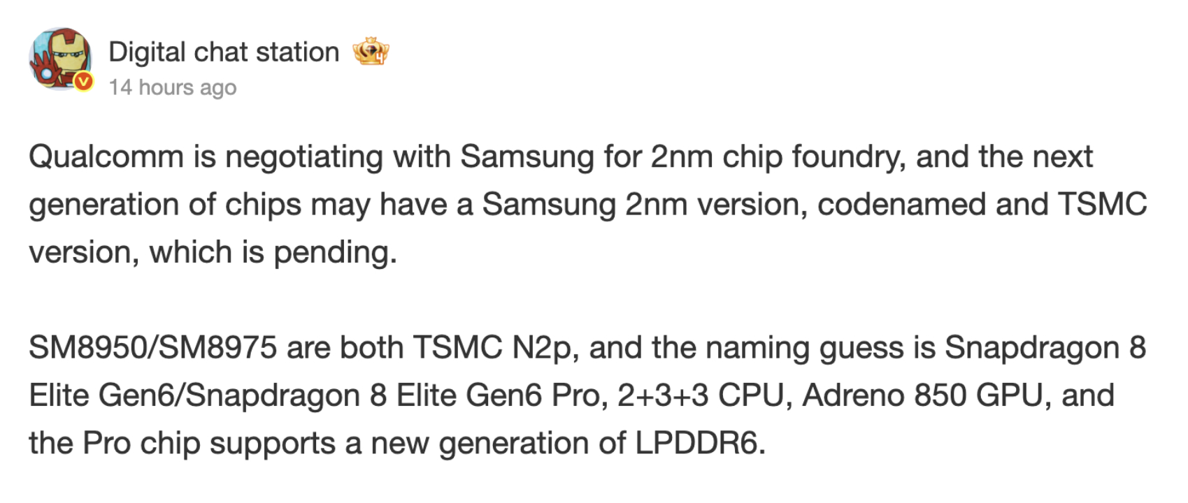 A Digital Chat Station szerint nem biztos, hogy a TSMC az egyetlen öntöde, amelyhez a Qualcomm a Snapdragon 8 Elite Gen 6 generációs chipsetjeihez fordult. A Weibo-n írva a kiszivárogtató arról számol be, hogy ebben a generációban a Samsung 2 nm-es változata is megtalálható lehet.