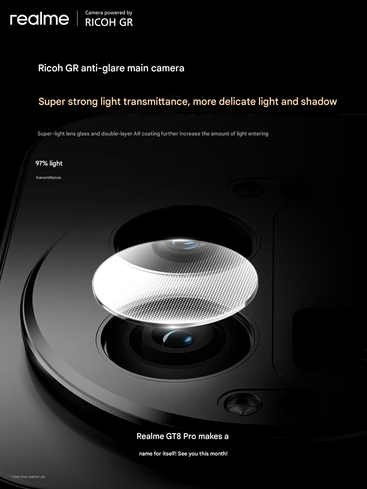 Valószínű, hogy a Realme GT8 Pro fő kamerája megtartja a 23 mm-es lencsét, miközben a kamera alkalmazáson keresztül 28 mm-es vagy 40 mm-es (a Ricoh GR IIIx-ben bevezetett) lencsére válthatunk. Ez a két gyújtótávolság különösen alkalmas az utcai fotózásra, egy olyan területre, ahol a Ricoh GR hagyományosan jelentős tekintélyt képvisel. Egy kereső üzemmódot is tartalmazni fog. A Weibo-n nemrégiben megosztott hivatalos teaserek szerint és a X, a Realme elárulta, hogy a GT8 Pro "tükröződésmentes" lencsével van felszerelve - hasonlóan a Vivo zászlóshajókon található Zeiss T* bevonathoz - a nem kívánt artefaktumok, például a tükröződések csökkentése és részletes és élénk pillanatképek készítése érdekében