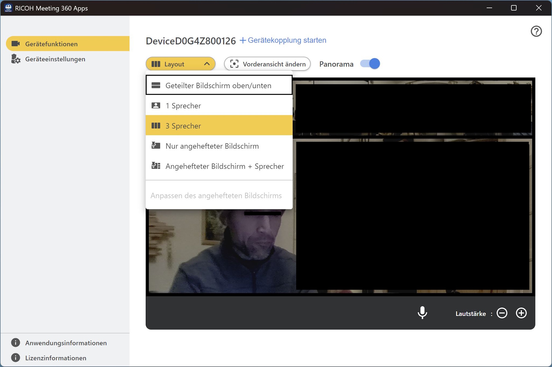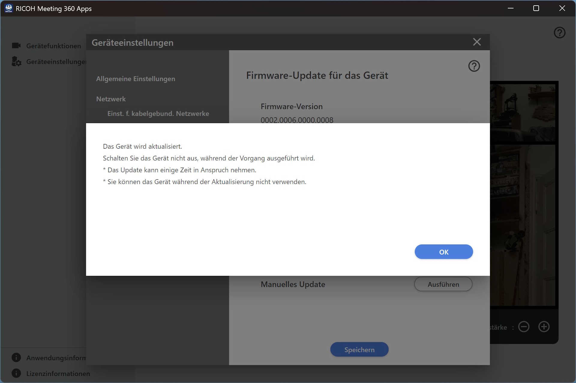 A Ricoh a Ricoh Meeting 360 alkalmazást is biztosítja. Onnan a felhasználók firmware-frissítést kezdeményezhetnek (az eszközt előzetesen LAN-on keresztül kell csatlakoztatni), konfigurálhatják az elrendezési beállításokat, és egyéb beállításokat módosíthatnak.