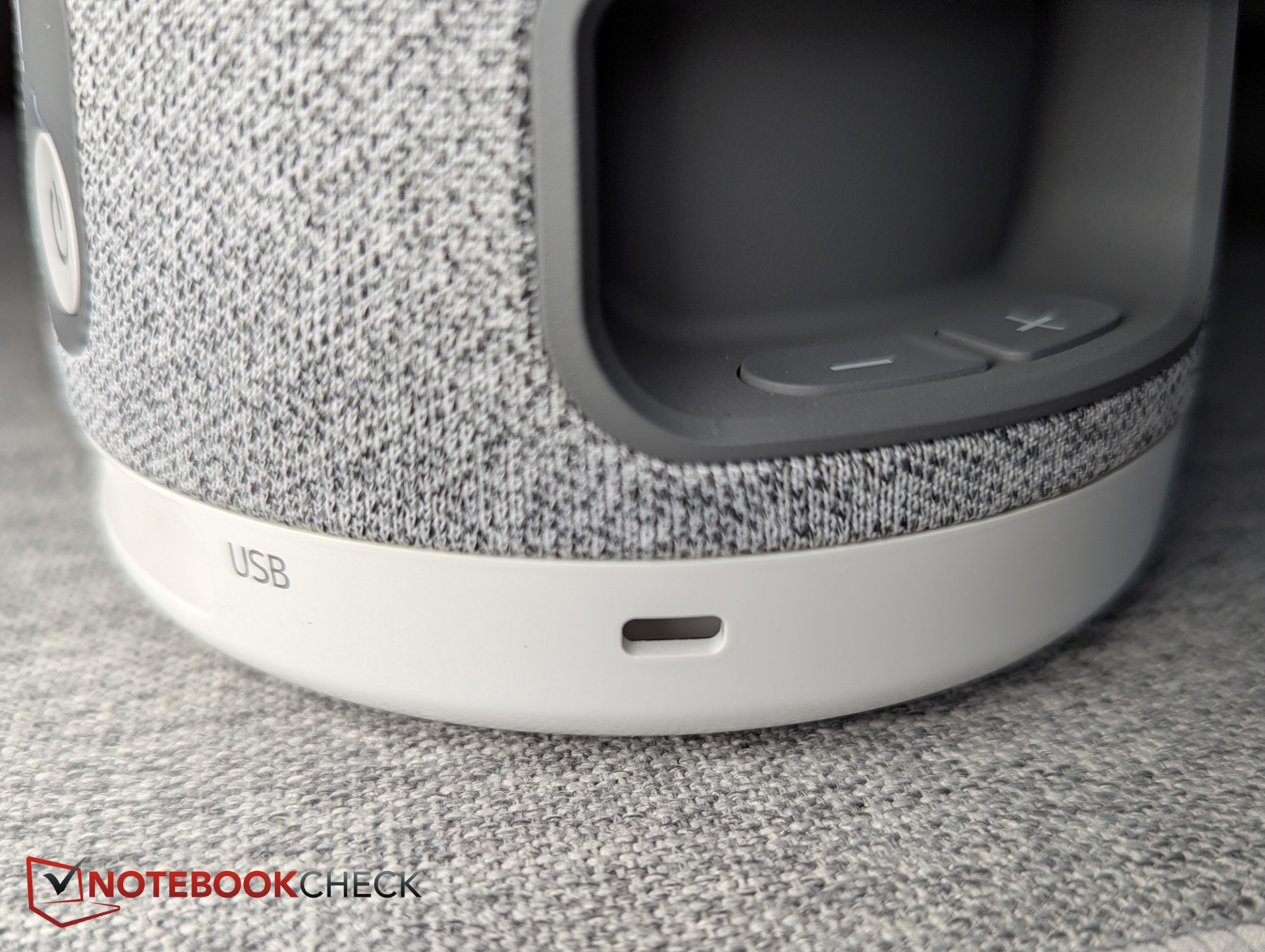 Az alsó harmadban három hangszóró van szürke szövetbe burkolva. A hangerőgombok a készülék két oldalán találhatók. Az összes port alul helyezkedik el.