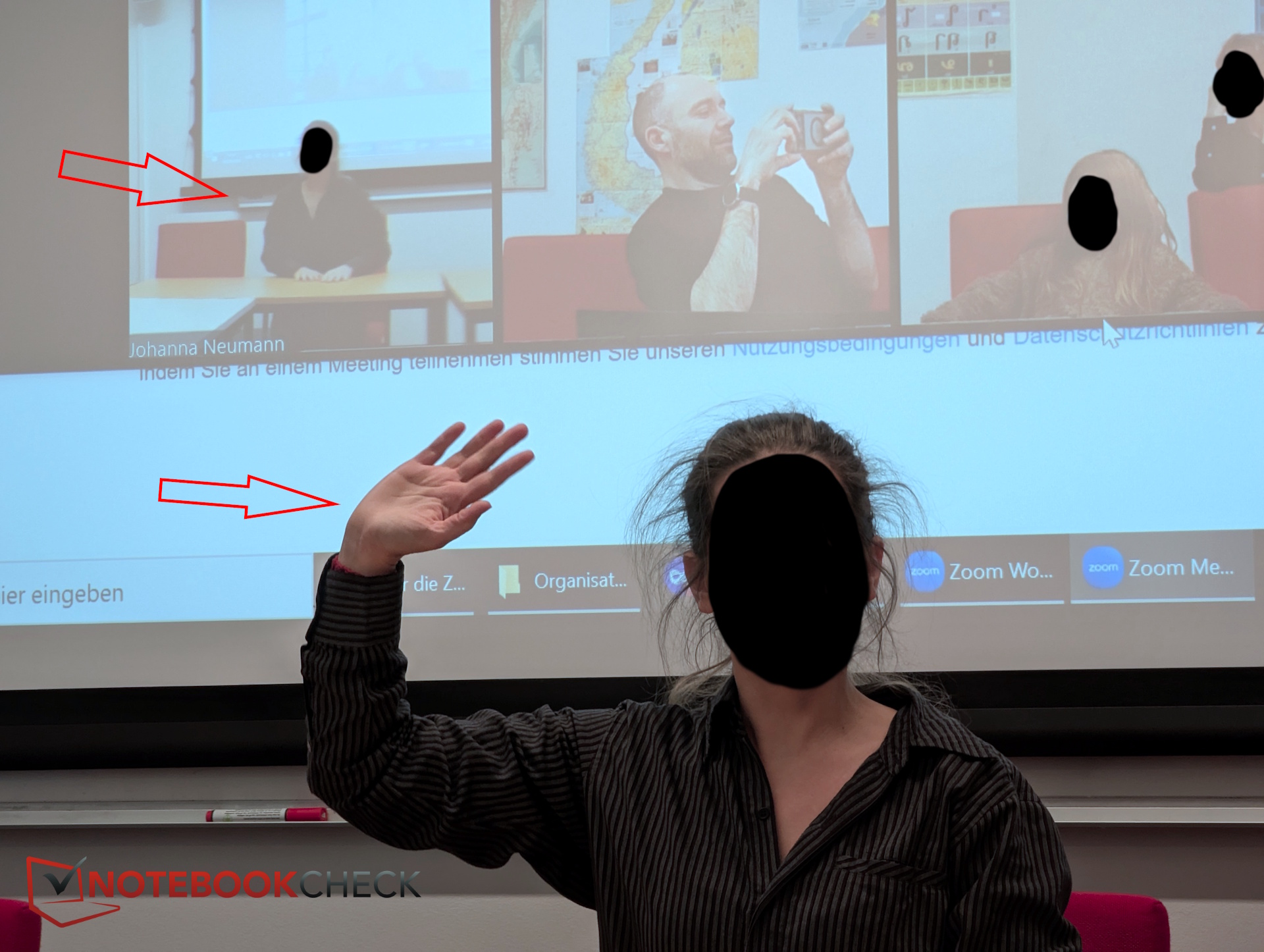 További tesztelés céljából ellátogattunk a berlini Humboldt Egyetemre, ahol a konferencia központot egy szemináriumi teremben értékeltük, ahol a résztvevők különböző pozíciókban ültek. Egy további résztvevő Zoom videohíváson keresztül csatlakozott.