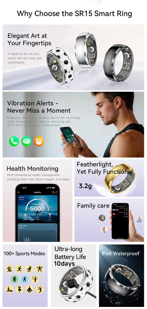 Ami az egészségfigyelést illeti, a gyűrű nyomon követi a pulzusszámot, a vér oxigénszintjét, az alvás minőségét és a stresszt. Támogatja a menstruációs ciklus nyomon követését is, és tartalmaz egy "Remote Care" funkciót, amely lehetővé teszi a felhasználók számára, hogy az alkalmazáson keresztül figyelemmel kísérjék a családtagok egészségügyi adatait. A fitneszhez a szoftver 100 sportmód átfogó listáját tartalmazza, amely rögzíti az edzés időtartamát és a kalóriaégetést.