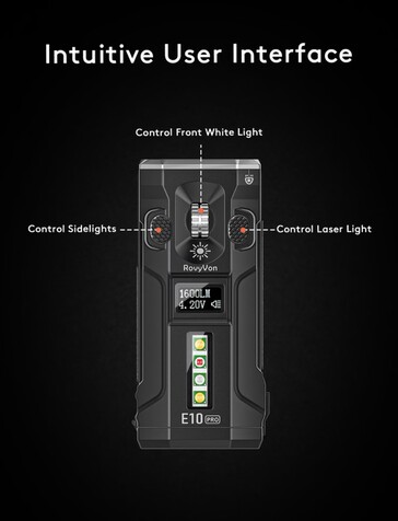 A görgetőkeréktől jobbra található gomb aktiválja a zöld 5 mW-os lézermutatót. Turbó üzemmódban a zseblámpa fényereje 1600 lumen, üzemideje pedig 50 perc. "Alacsony" üzemmódban a RovyVon E10 50 lumen fényerővel világít 8,5 órán keresztül, míg Eco üzemmódban a fényerő 5 lumenre csökken, de az üzemidő 50 órára nő. A tápellátás két 14500-as újratölthető akkumulátorról történik, a töltés pedig USB-C-n keresztül