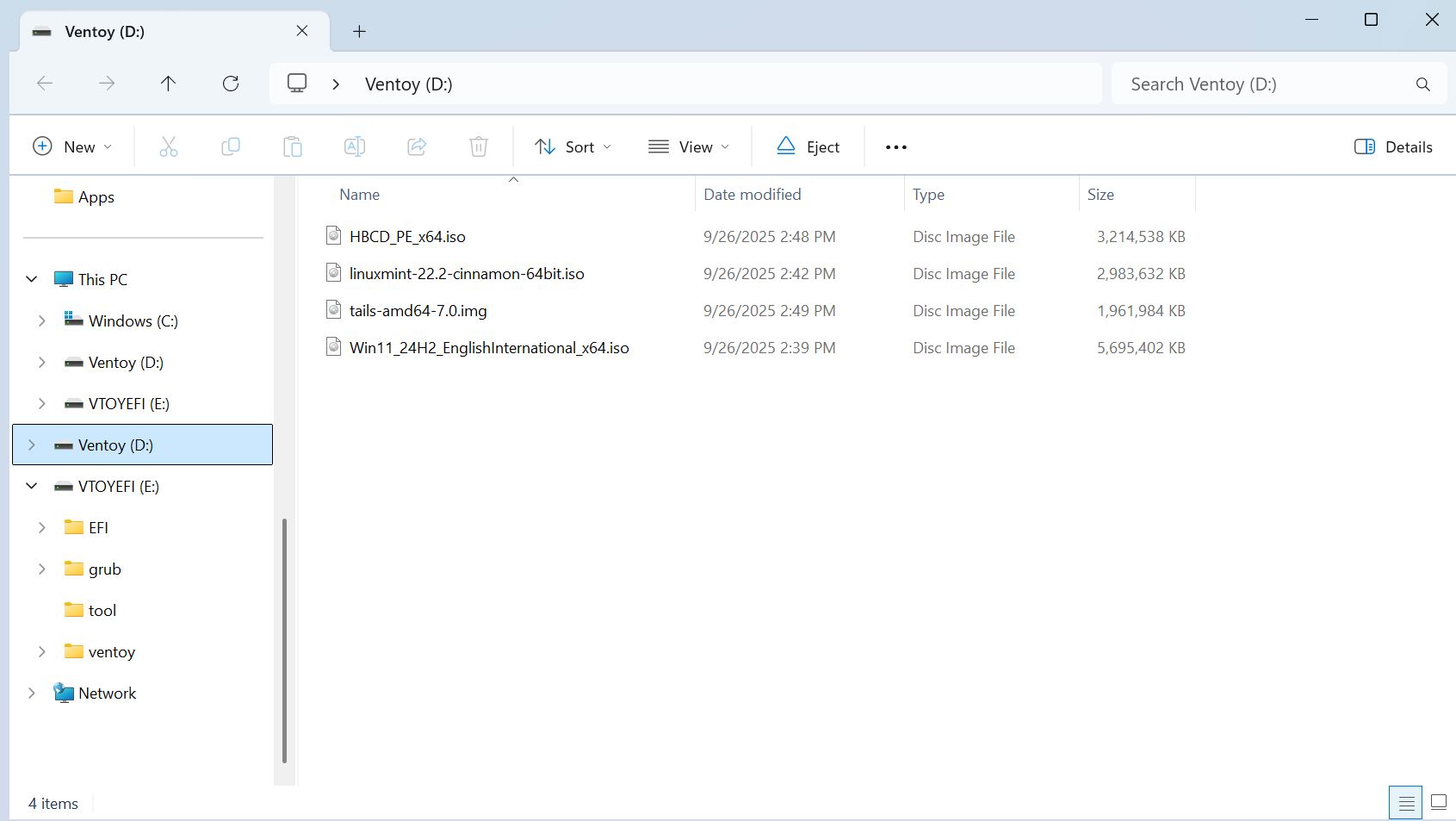 Így egyetlen USB-indítólemezre egy Windows 11 kép, több Linux-disztribúció, mentőeszközök, Tails vagy más operációs rendszerek is kerülhetnek. És ha bármikor le akar cserélni egy képet, csak törölje a régit, és tegyen hozzá egy újat - nem kell újra beállítani a pendrive-ot. Számomra ez a tökéletes image-flashelő eszköz az OS ISO-khoz. A Ventoy Windowson és Linuxon egyaránt működik, letölthető a oldalról ingyenesen.