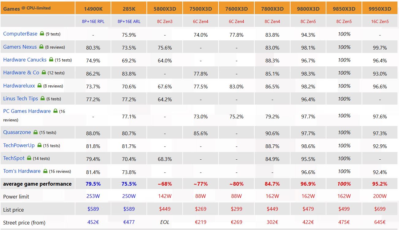 A nemrég bemutatott 499 dolláros Ryzen 7 9850X3D az AMD leggyorsabb játékprocesszora. A 3DCenter 14 bemutatkozó véleményt elemző elemzése szerint a Ryzen 7 9850X3D állítólag körülbelül 3,2%-kal gyorsabb játékban, mint a Ryzen 7 9800X3D, 5%-kal gyorsabb, mint a Ryzen 9 9950X3D, és 32%-kal gyorsabb, mint a Core Ultra 9 285K. A Ryzen 7 9850X3D hozzáadott játékteljesítménye azonban jóval magasabb energiafogyasztás árán érhető el.