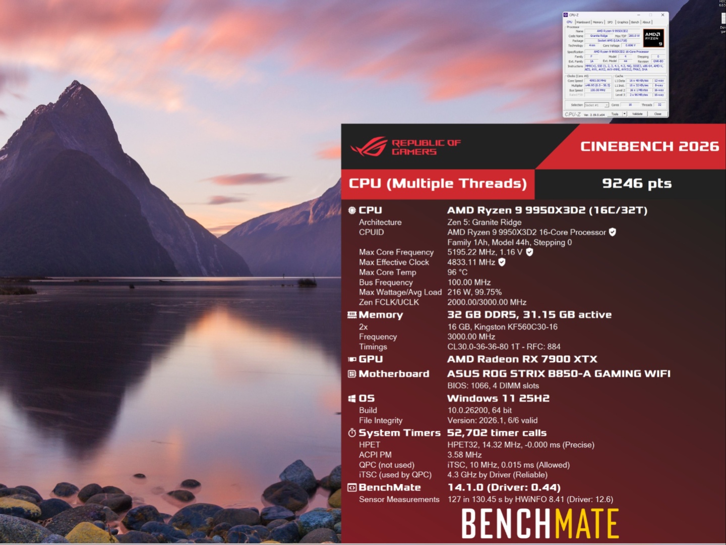 Kezdve a 7-Zip teszteléssel, a 9950X3D2 227 919 MIPS-ről számolt be, a CPU 5,13 GHz-et és 96 fokos hőmérsékletet ért el. A Cinebench 2026 egymagos pontszám 746 pont volt 5,4 GHz-es órajelen és 76 fokos hőmérsékleten. A többmagos pontszám 96 fokos hőmérsékleten és 5,19-es maximális órajelen 9 246 pont volt. Végül a Cinebench R23 Multi Core pontszáma 38 579 pont volt 95 fokos hőmérsékleten és 5,19 GHz-es maximális órajelen. Ami a fogyasztást illeti, a Ryzen 9 9950X3D2 a Cinebench R23 tesztben maximum 220 W-ot ért el. A CPU-Z ablakban 200W TDP-t mutat a CPU, ami összhangban van az AMD által megadott értékkel.