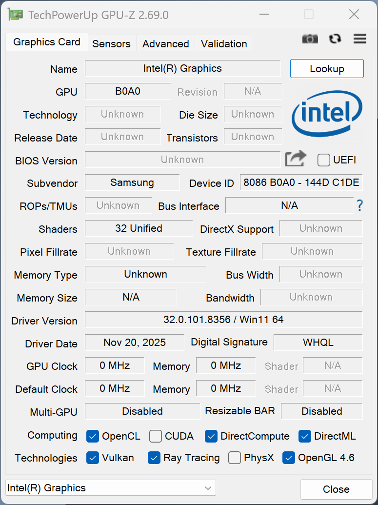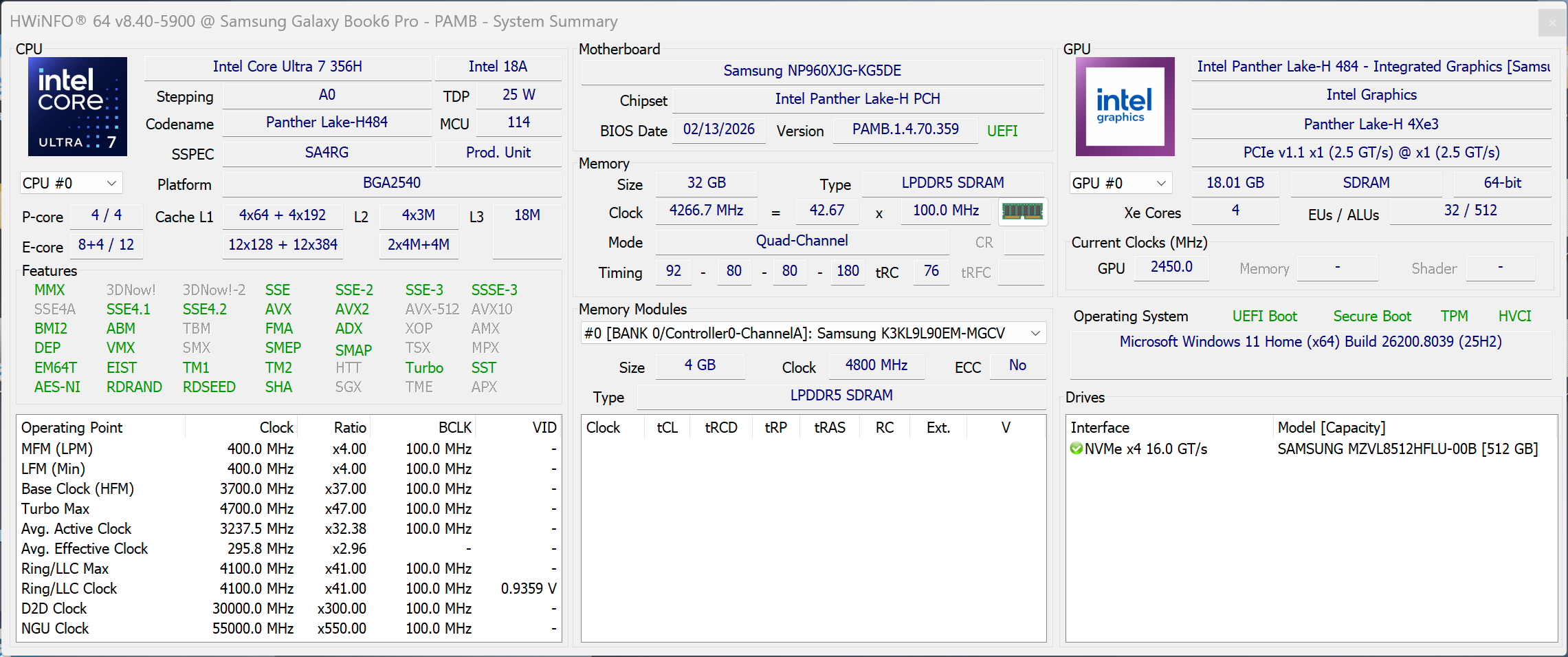 | Samsung Galaxy Book6 Pro Intel Core Ultra 7 356H ⎘ Intel Graphics 4 Xe3 Panther Lake iGPU ⎘ 32 GB Memória, 512 GB SSD | Amazon: List Price: 2199€ | 1.6 kg | 11.9 mm | 16.00" 2880x1800 212 PPI OLED | |
