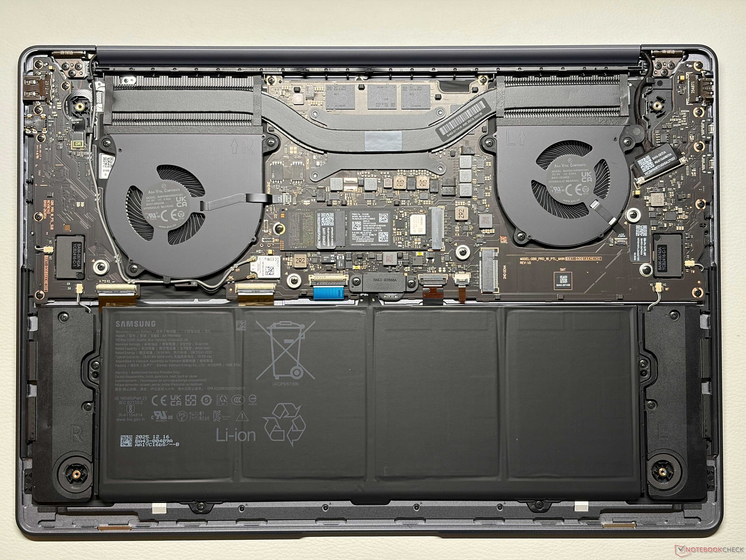 Az alváz kialakítása nagyjából megegyezik az előző modellével, ami azt jelenti, hogy ismét egy karcsú, 16 hüvelykes laptopot kapunk, kiváló minőségű alumíniumvázzal. Az ezüst szín nem igazán vonzza az ujjlenyomatokat, a stabilitás pedig kiváló. Különösen az alsó keret ismét nagyon vastag, és az új billentyűzet kialakítása, valamint a fedélen lévő, átrendezett Samsung logó lényegében az egyetlen két látható változás. A belső elrendezés is némileg változott, de továbbra is két teljes méretű M.2-2280-as SSD foglalatot kapunk, az összes többi komponens fedélzeti.