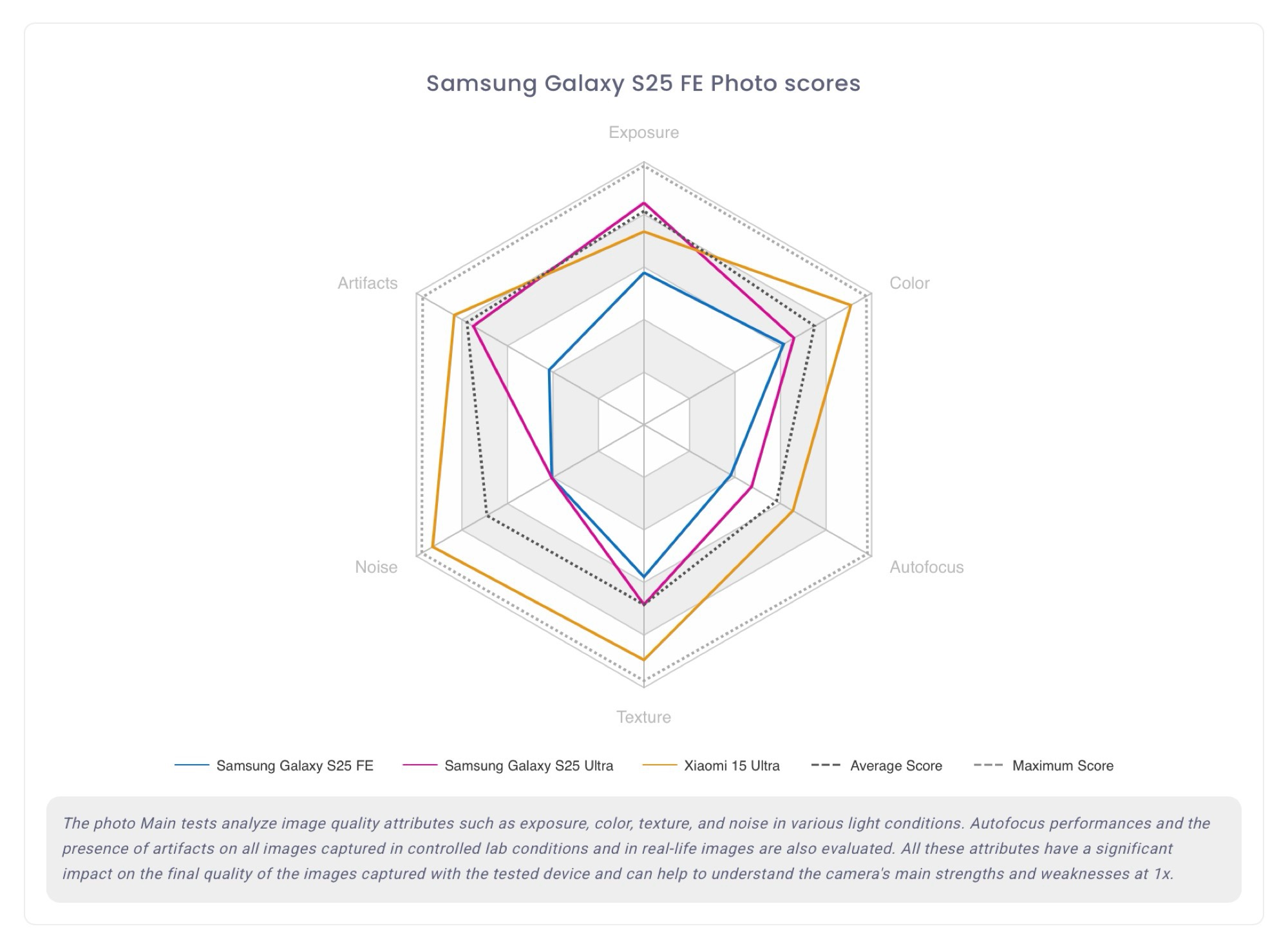A Galaxy S25 FE egy 50 MP-es f/1,8-as f/1,57 hüvelykes érzékelővel rendelkező 50 MP-es f/1,8-as fő fényképezőgépet, egy 12 MP-es f/2,2-es ultraszéles kamerát egy apró 1/3 hüvelykes érzékelővel, valamint egy 8 MP-es f/2,2-es teleobjektív kamerát tartalmaz egy még kisebb 1/4,4 hüvelykes érzékelővel és 3x-os optikai zoommal. A DxOMark részletes kameraelemzése most megmutatta, hogy valójában milyen kompromisszumokat kell kötni ebben a három kamerával rendelkező konfigurációban. A 118-as pontszámmal a Galaxy S25 FE a 123. helyet foglalja el a globális ranglistán - megelőzve még az ötéves Apple iPhone 12 Pro Max (131 pont) és a kedvezőbb árú Google Pixel 6a (122 pont) is
