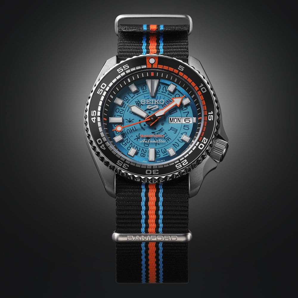 Ez a limitált kiadású modell az archív Seiko 5 Sports "SKX" sorozatra utal, és a "Retro Future" témát viseli az egész designban. A csontvázas számlap több fényes (és szokatlan) Bamford-ihletésű jelekkel rendelkezik, leginkább egy teal számlap, amelyet merész narancssárga, kék és fehér elemek hangsúlyoznak mind az arcon, mind a nejlonszíjon. A kezek, indexek és a lünetta LumiBrite-rel vannak kezelve. A 6 órás pozícióban, a tok hátlapján és a szíj egyedi fémhurokján egy Bamford-logó található. Az óra átlátszó tokkal rendelkezik, amelyen egyedi sorozatszámok találhatók.