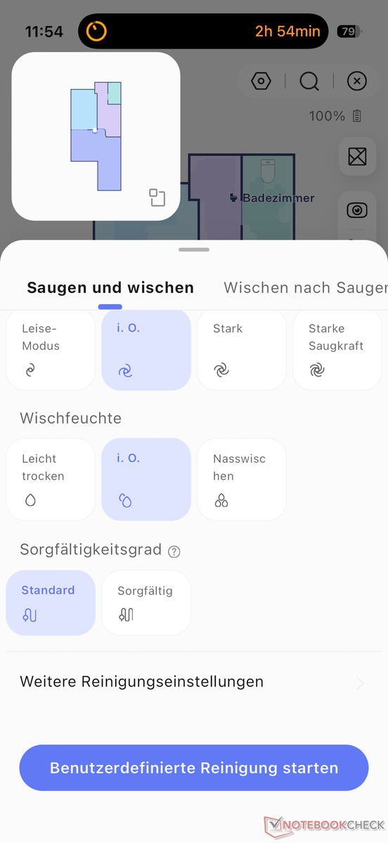 50 négyzetméternyi porszívózás és felmosás után a Narwal Flow alapbeállításokkal még mindig körülbelül 70 százalékos akkumulátorteljesítménnyel rendelkezett. Ez azt jelenti, hogy még nagyobb háztartások is kitakaríthatók egyetlen töltéssel. Itt a Narwal Flow lényegesen jobban teljesít, mint a Dreame Aqua10 Ultra Roller Complete. A Flow azonban szintén nagyon lassan töltődik, és több órát vesz igénybe.