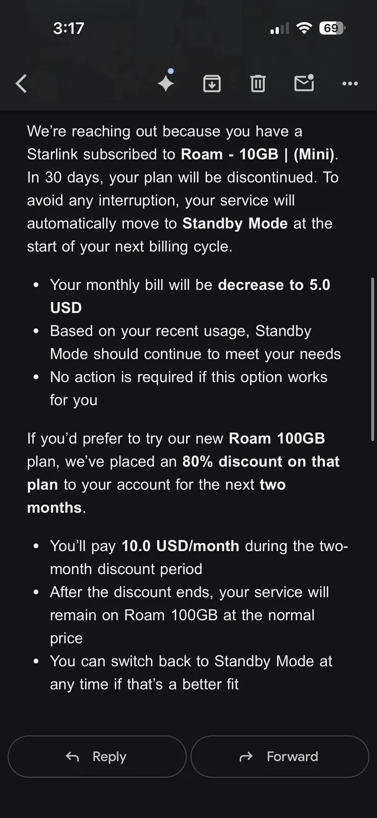 A Starlink ezt nem tűri, és most figyelmezteti a 10 dolláros csomag felhasználóit, hogy automatikusan átváltanak az 5 dolláros készenléti módra, mivel a használati szokásaik alapján ez elegendő lenne az igényeik kielégítésére.