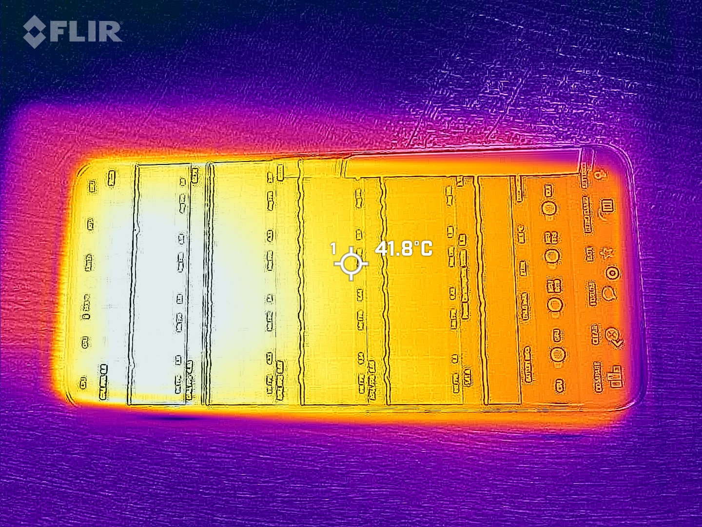 (-) A felső oldalon a maximális hőmérséklet 46.8 °C / 116 F, összehasonlítva a 35.2 °C / 95 F átlagával , 21.9 és 247 °C között a Smartphone osztálynál.