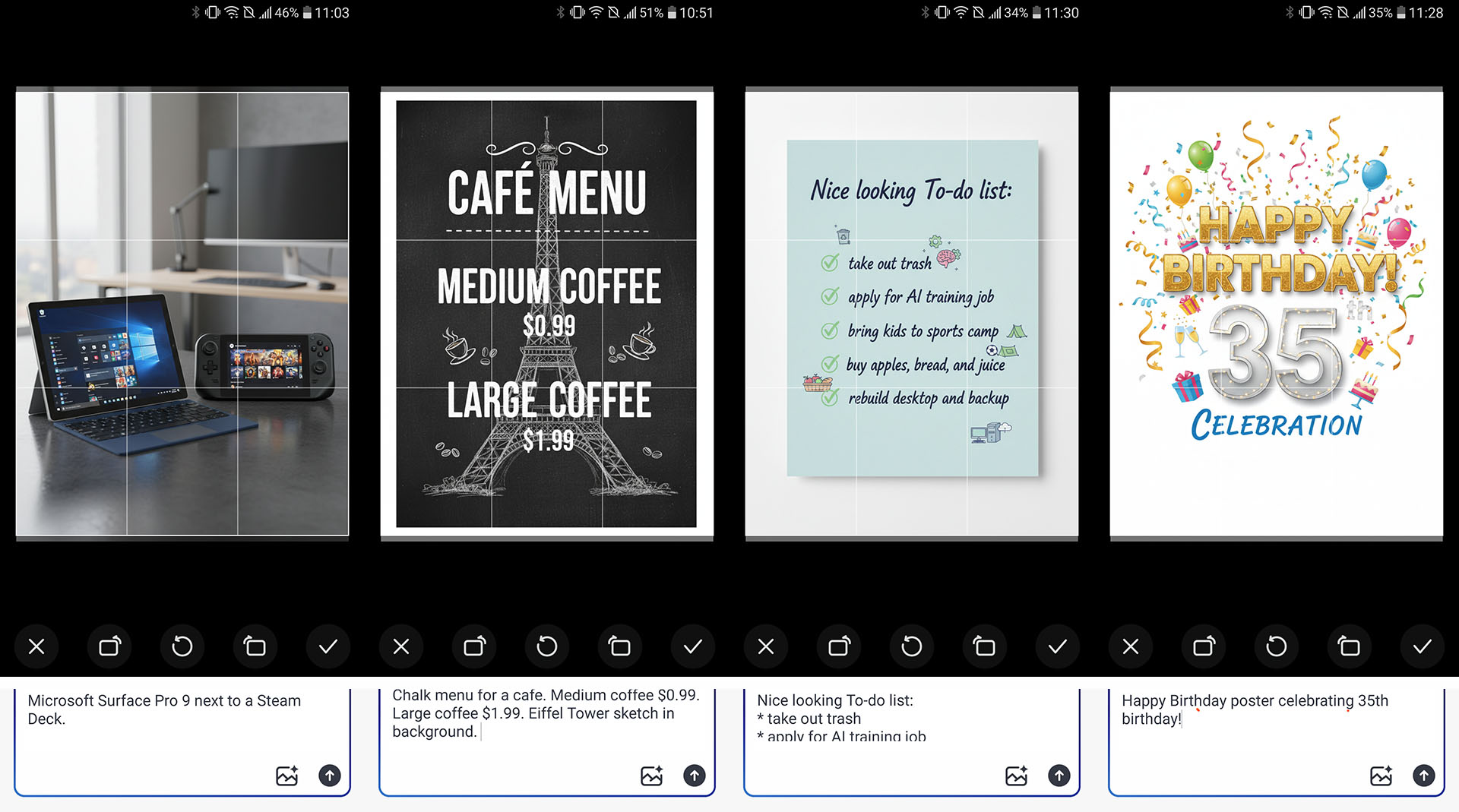 A mesterséges intelligencia gyenge a tényszerűen helyes szöveg, térképek és naptárak létrehozásában, meglehetősen megbízható a teendőlisták és menük létrehozásában, időnként megbízhatatlan a jól ismert figurák létrehozásában, és elég jó a rajzfilmszerű művészet, pihentető természeti jelenetek vagy aranyos golden retrieverek tömegének létrehozásában. A prompt művészeti generálás során előfordulhatnak hallucinációk, például egy folyón közlekedő vonat vagy egy helytelen tárgy megjelenítése.