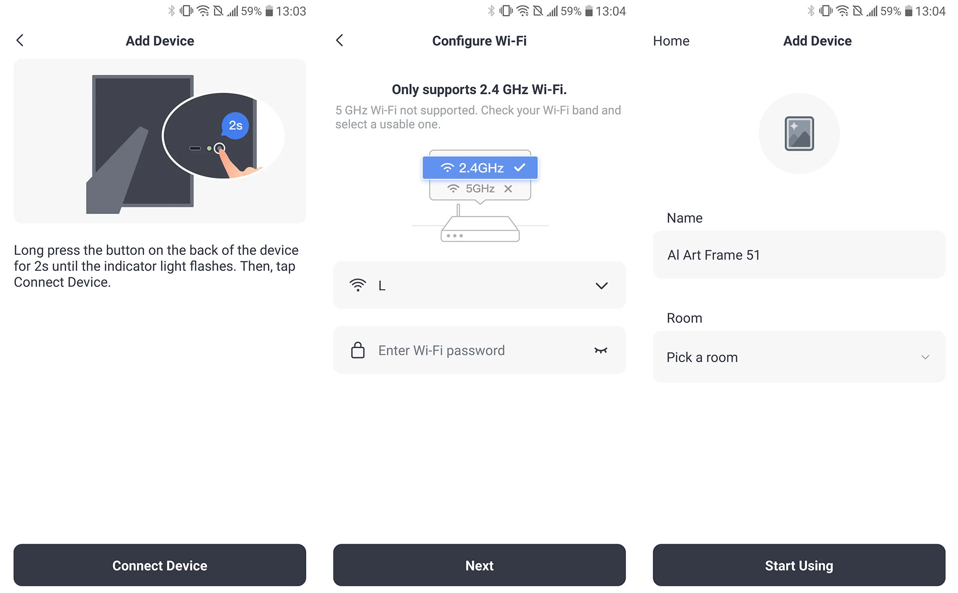 A szoftver könnyen telepíthető, és a művészeti keret hozzáadása csak a hátsó vezérlőgomb egyszerű megnyomását igényli a párosítási mód aktiválásához.