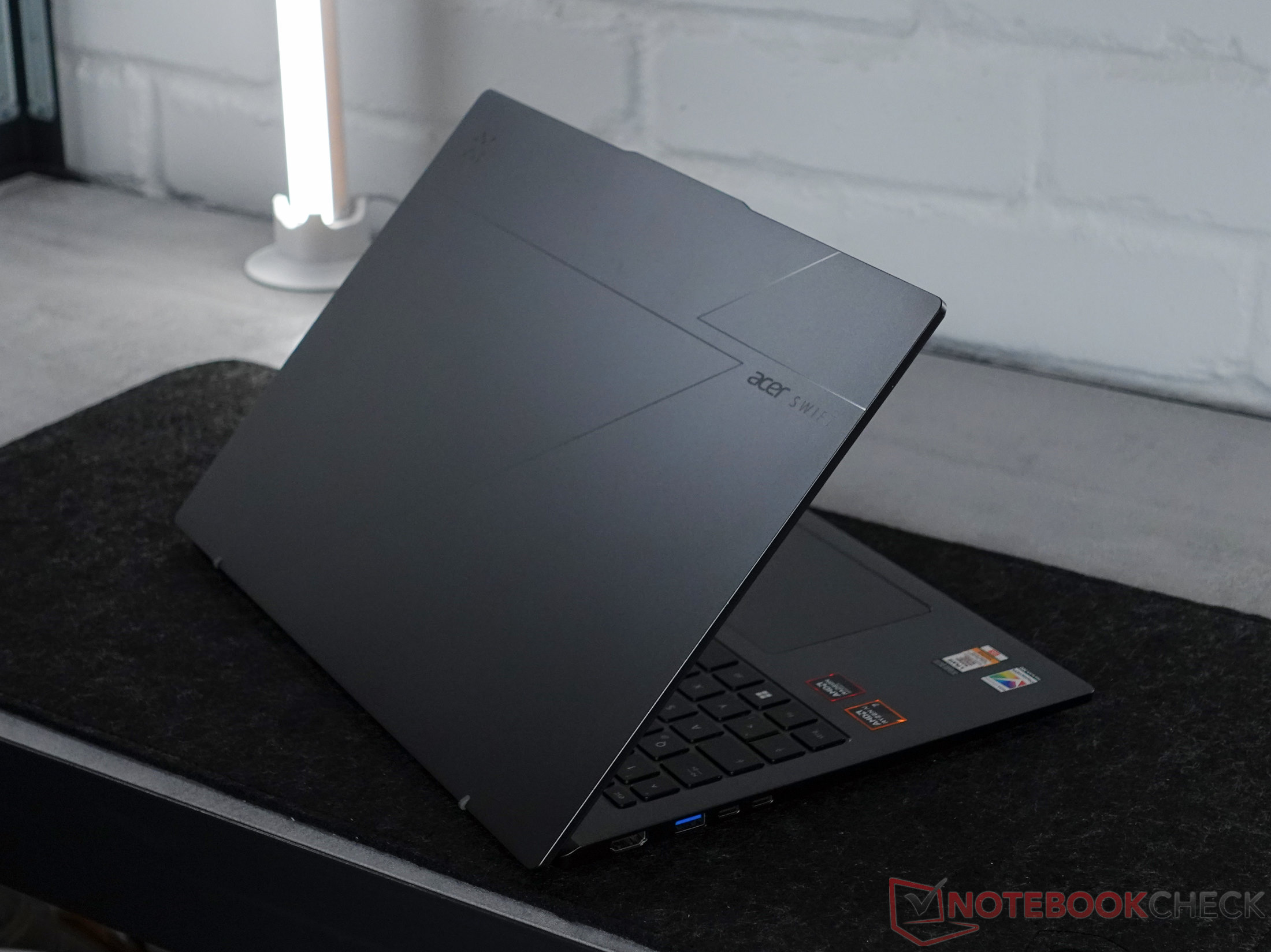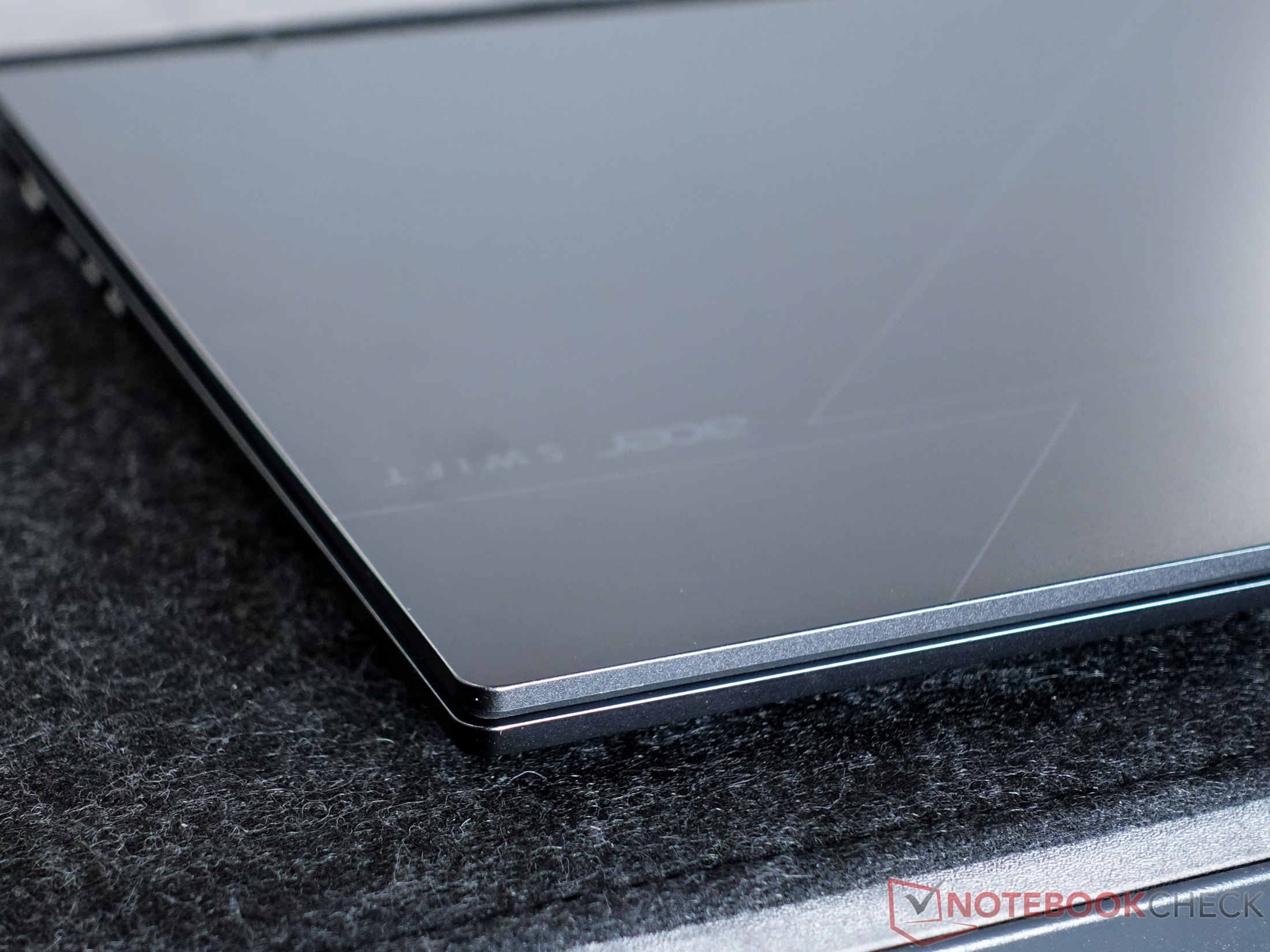 Az Acer Swift Go karcsú, kissé szögletes és alumíniumból készült. A képernyő fedelét finom vonalak és finom márkajelzés díszíti. Egy kézzel kinyitva a laptop hátul kissé megemelkedik, ami javítja az ergonómiát és a hűtést. Ez a laptopnak csúcskategóriás megjelenést kölcsönöz.