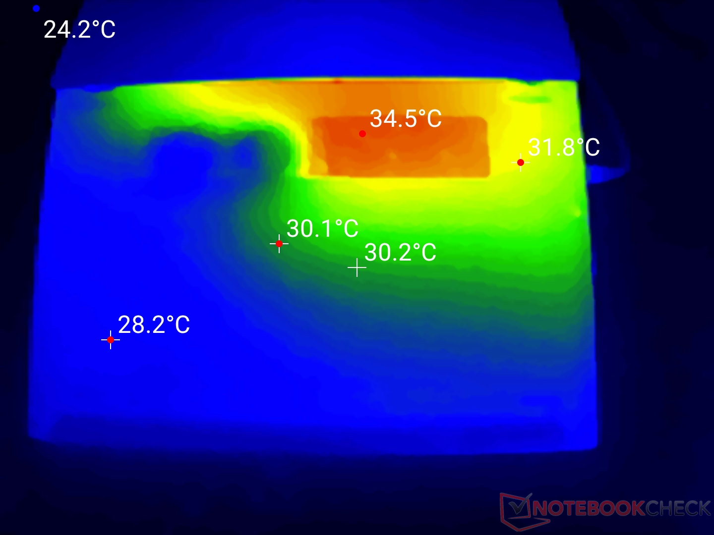 (±) A felső oldalon a maximális hőmérséklet 45 °C / 113 F, összehasonlítva a 36.9 °C / 98 F átlagával , 21.1 és 71 °C között a Multimedia osztálynál.