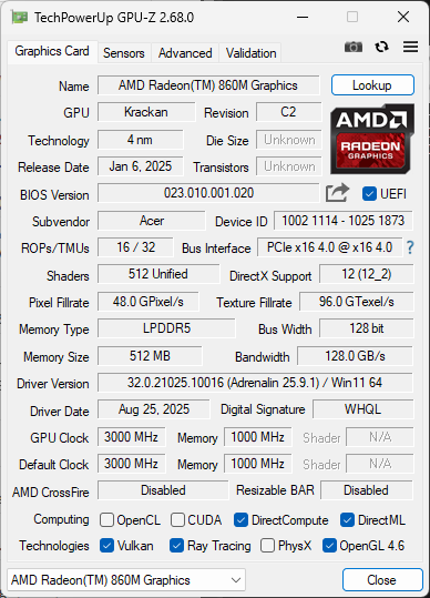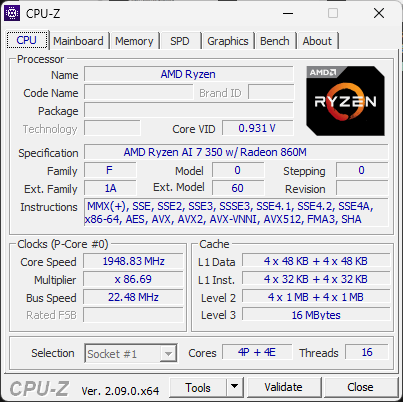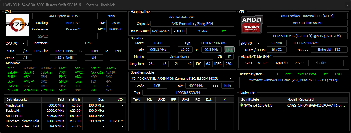 Az Acer többféle hardverkonfigurációt kínál a Swift Go AI-hoz. Tesztkészülékünk az AMD Ryzen AI 7 350 processzorral van felszerelve, amelyhez 16 GB RAM társul, ami az erős processzorhoz képest kissé korlátozottnak tűnik.