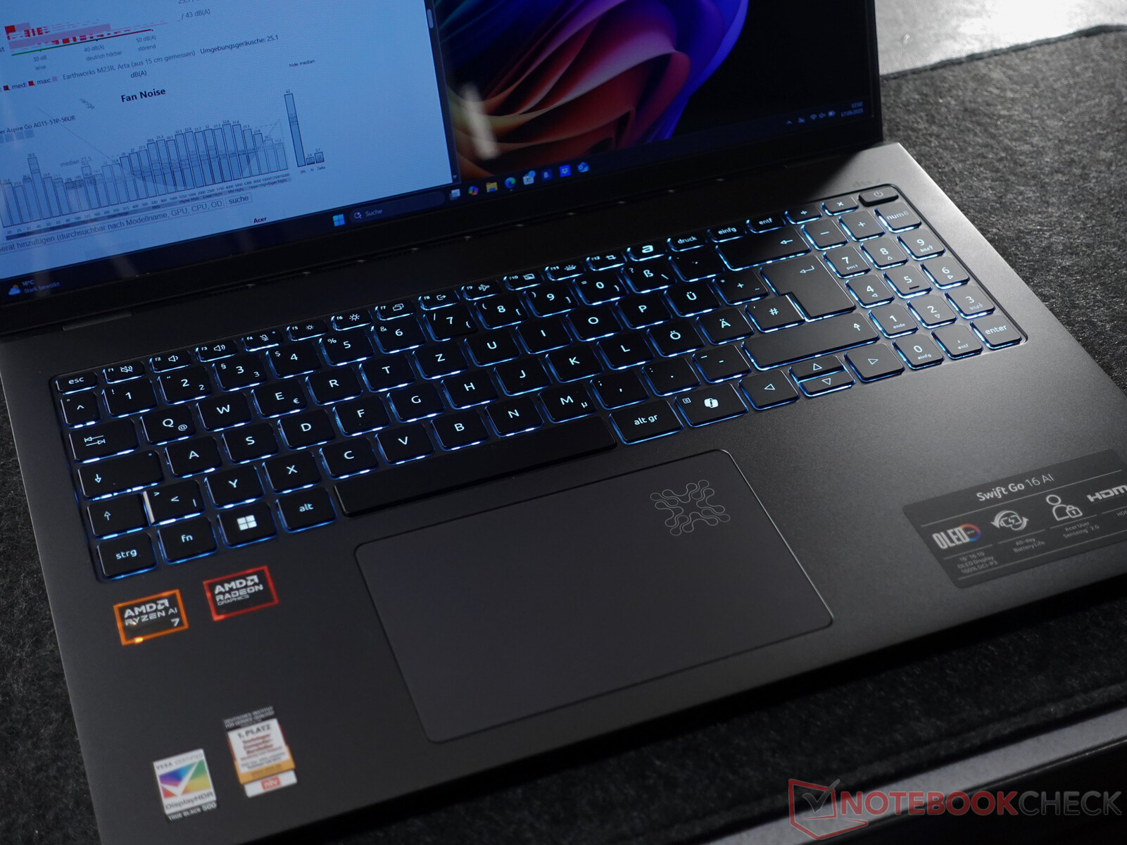 A Swift Go 16 AI billentyűzete teljes kiosztást kínál, beleértve egy dedikált számblokkot is. A billentyűket háttérvilágítás és szép, jól definiált nyomáspontok jellemzik. A nagyméretű touchpad pontosan működik. Különlegességként finom fényeffektusokon keresztül jelzi, ha a processzor NPU-ját (Neural Processing Unit) vagy más AI-funkciókat aktívan használnak.