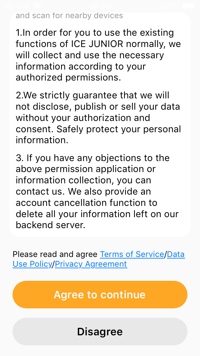 Töltés közben a legjobb, ha letölti az ICE Junior alkalmazást (elérhető a Android és az iOS rendszerekre), amely "vendég" üzemmódban is használható. A teljes adatvédelmi szabályzatot elolvasva azonban az a benyomásunk, hogy a gyártó meglehetősen sok adatot gyűjthet, azokat esetleg az EU-n kívül tárolja, és harmadik fél szolgáltatókkal is megoszthatja - ez nem éppen ideális egy gyerekeknek szánt termék esetében. Az alkalmazással való párosítás egyszerű, amennyiben minden engedélyt megadunk.