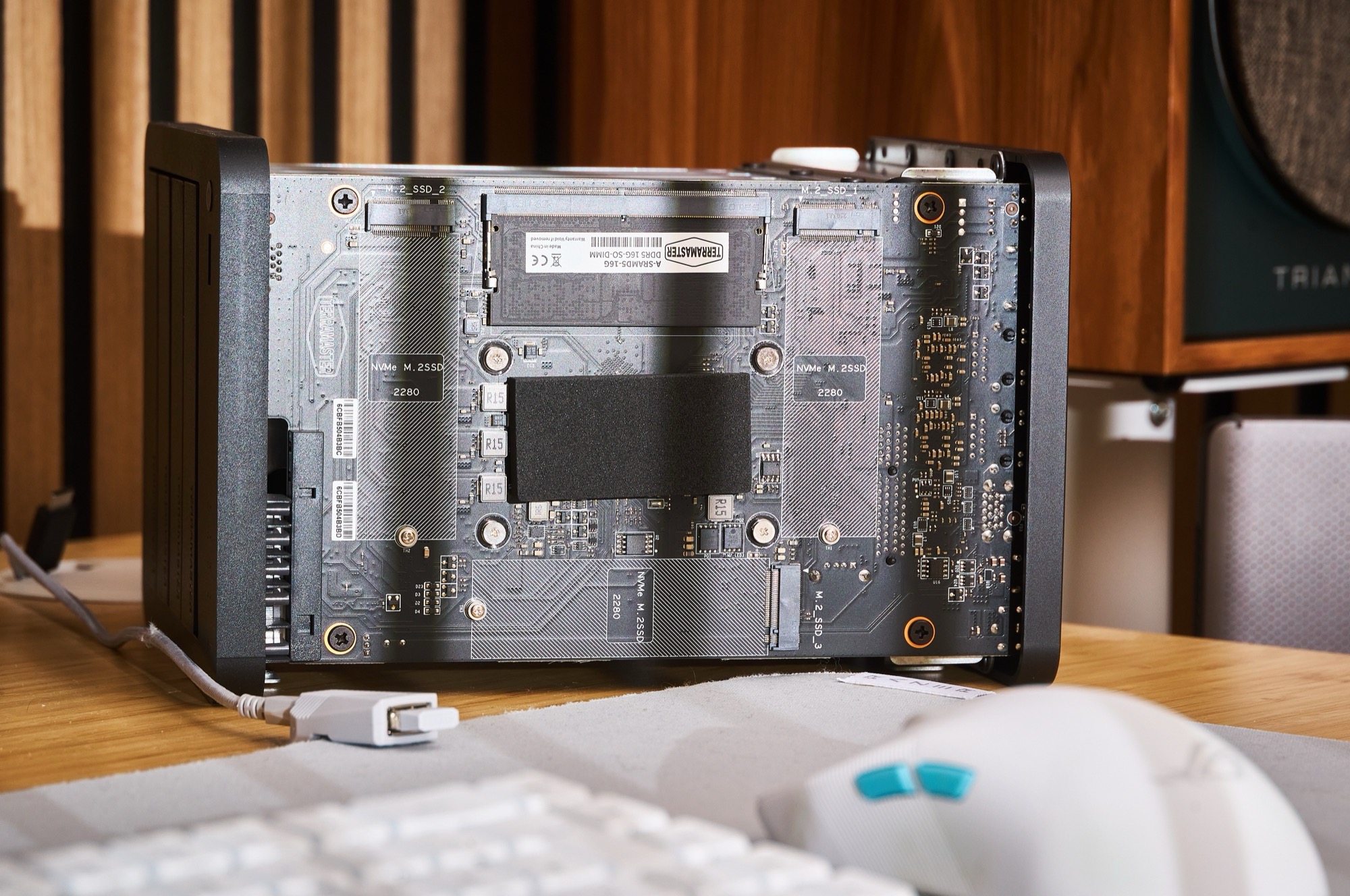 A négy meghajtórekesz ebben az árkategóriában szinte már szabványosnak számít egy NAS esetében. Ami a TerraMaster F4-425 Plus-t kiemeli a többi közül, hogy nem áll meg egy vagy két M.2-helynél, hanem hármat kínál. Ez lehetővé teszi, hogy az SSD-k RAID 5 konfigurációban működjenek, így a rendszer adatvesztés nélkül működhet tovább akkor is, ha az egyik meghajtó meghibásodik.