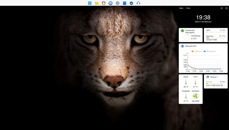A tesztelés során az Intel N150 elég gyorsnak bizonyult számos tipikus NAS-munkaterheléshez. A TOS 6 érzékeny reagál, és az egyidejű biztonsági mentések és a több eszközről történő fájlátvitel problémamentesen fut. Az igényesebb feladatok azonban türelmet igényelnek. 312 fénykép feldolgozása 60 megapixeles felbontásban a Immich oldalon tesztünkben nagyjából 85 percig tartott. Még a NAS-ra történő fájlmásolás közben is 20 százalék körüli kihasználtságon ül a processzor.