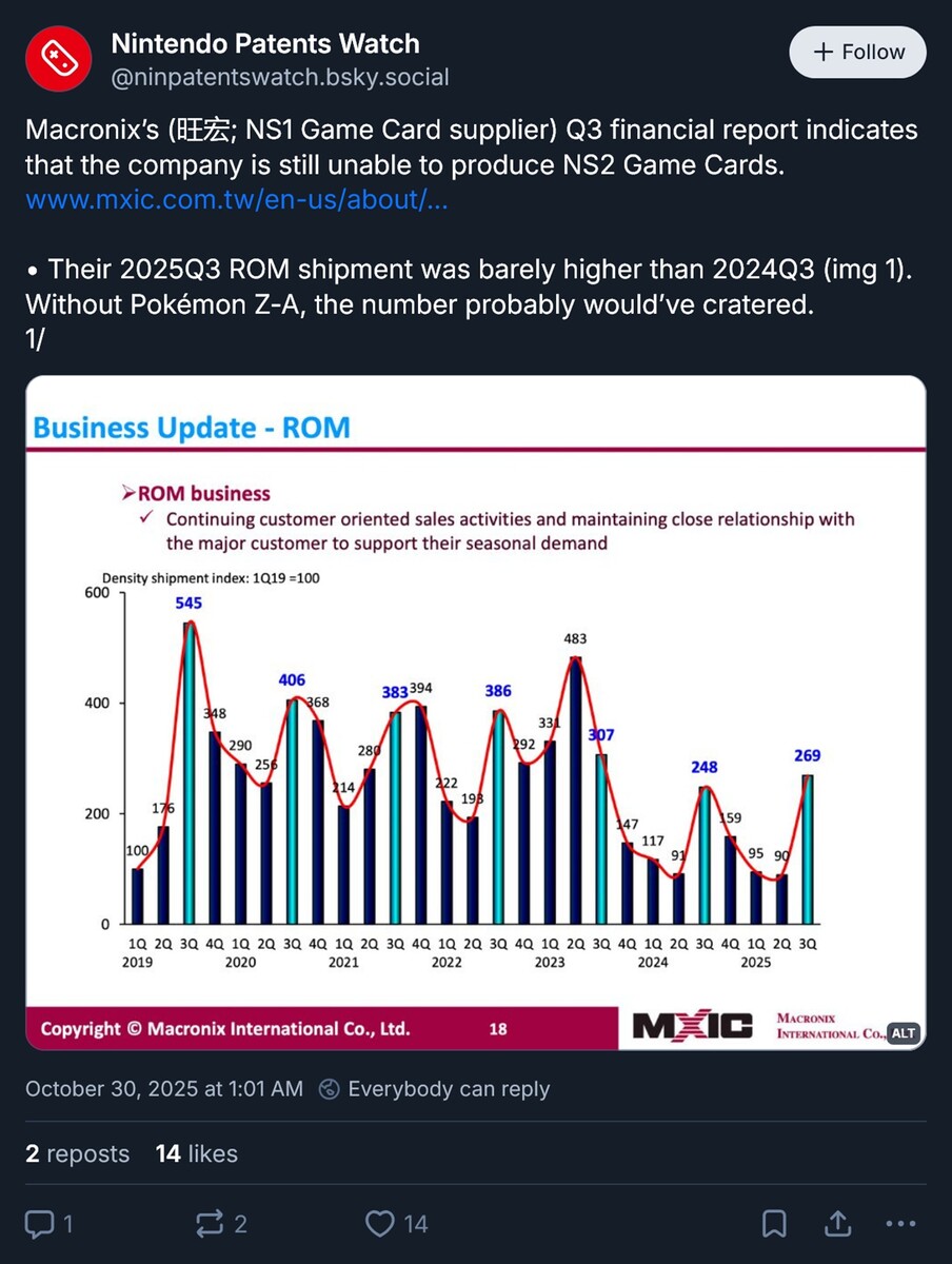 Nintendo Patents Watch a Bluesky oldalon tárgyalt a tajvani vállalat által kiadott negyedéves pénzügyi jelentésről. A Macronix elnöke kutatás-fejlesztési késedelmekre hivatkozott, amelyek hatással voltak a Switch 2 terveire. A gyártó azonban reményteljesebb kilátásokkal rendelkezik a "ROM-üzletág" 2026-os évére vonatkozóan.