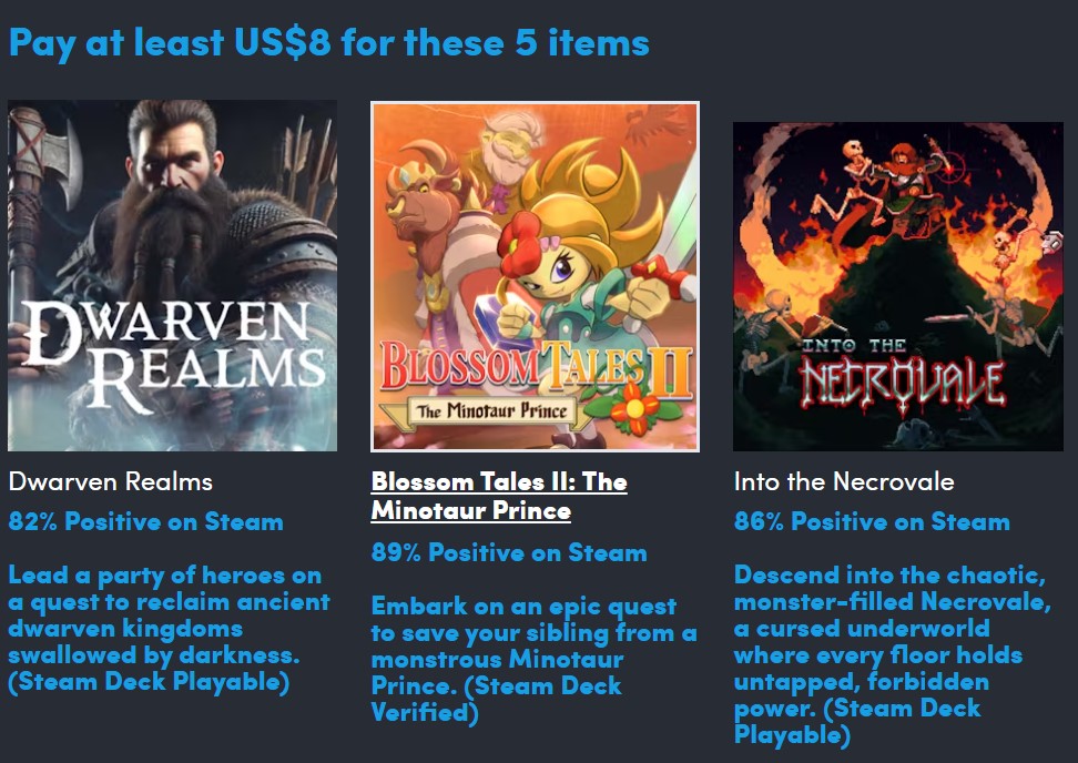 - Blossom Tales II - The Minotaur Prince: Ebben az akció-kalandjátékban Lily szerepében játszhatsz. A célod, hogy megállítsd a visszatérő Minotauruszkirályt és megmentsd a bátyádat. A fő történettel és a mellékküldetésekkel együtt körülbelül 15 órányi játékidőt kapsz ebben a címben. A játék 14,99 dollárba kerül a Steamen, a 200 értékelés 90%-a pozitív.