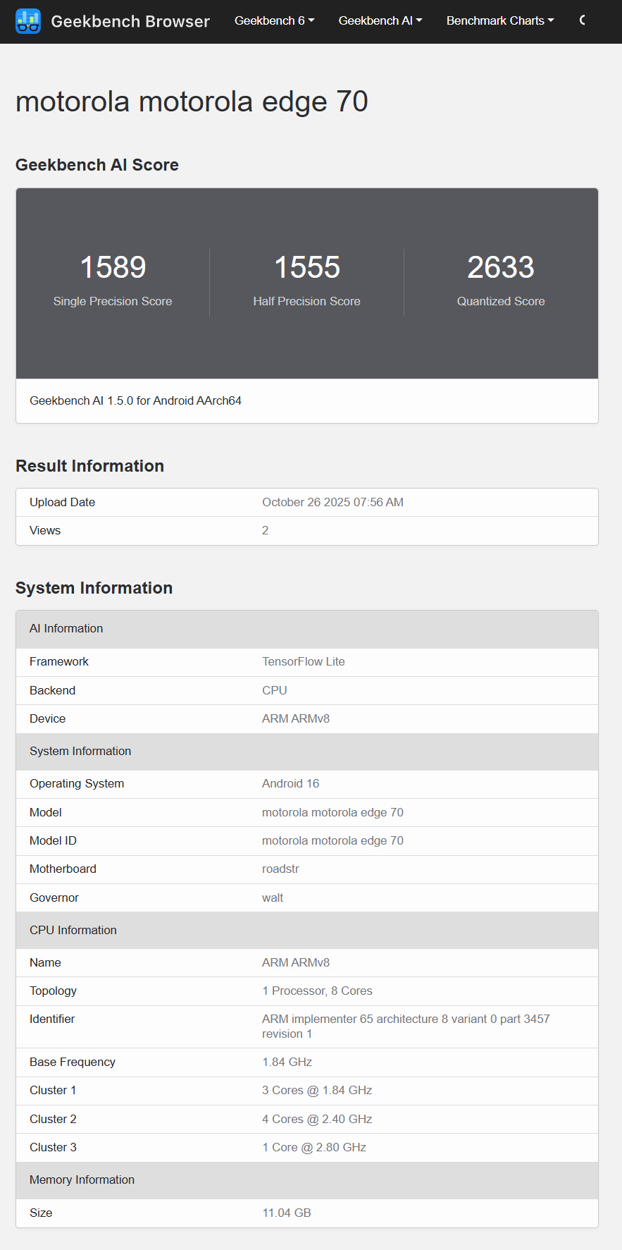 Ahogy az alábbi kép is mutatja, a Motorola ezt a lapkakészletet 12 GB RAM-mal és 512 GB tárhellyel párosította. A korai Geekbench eredmények szerint a Snapdragon 7 Gen 4 és a 12 GB RAM kombinációja lehetővé teszi, hogy az Edge 70 processzorteljesítménye megegyezzen az MediaTek Dimensity 8350-meghajtású Edge 60 Pro előtt.