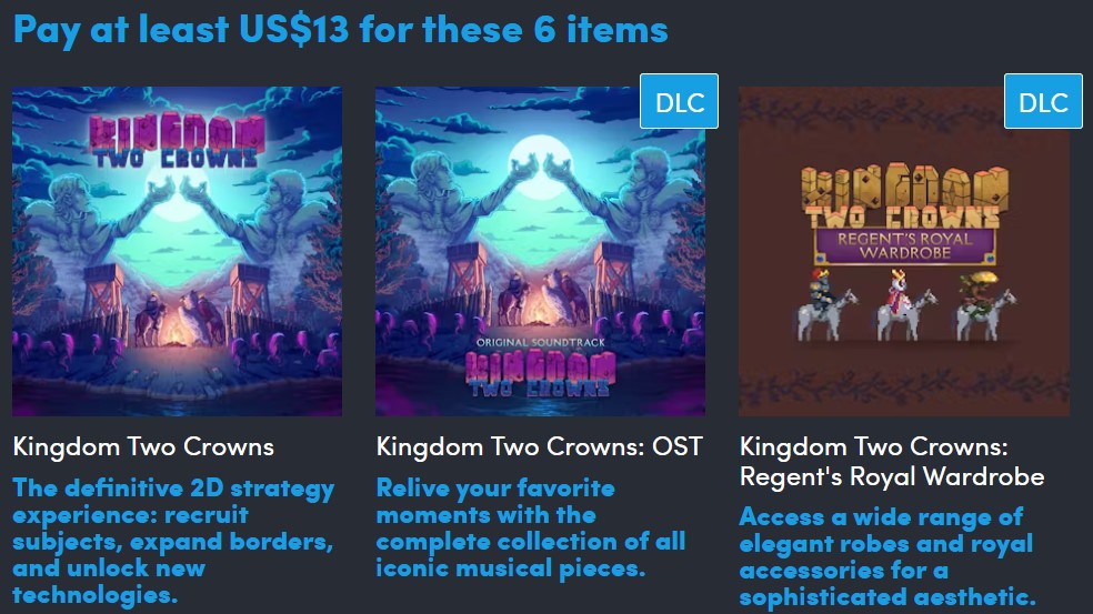- Kingdom Two Crowns - OST: Ez a DLC az alapjátékhoz egy hangsávot ad hozzá. Ez 9,99 dollárt ér.