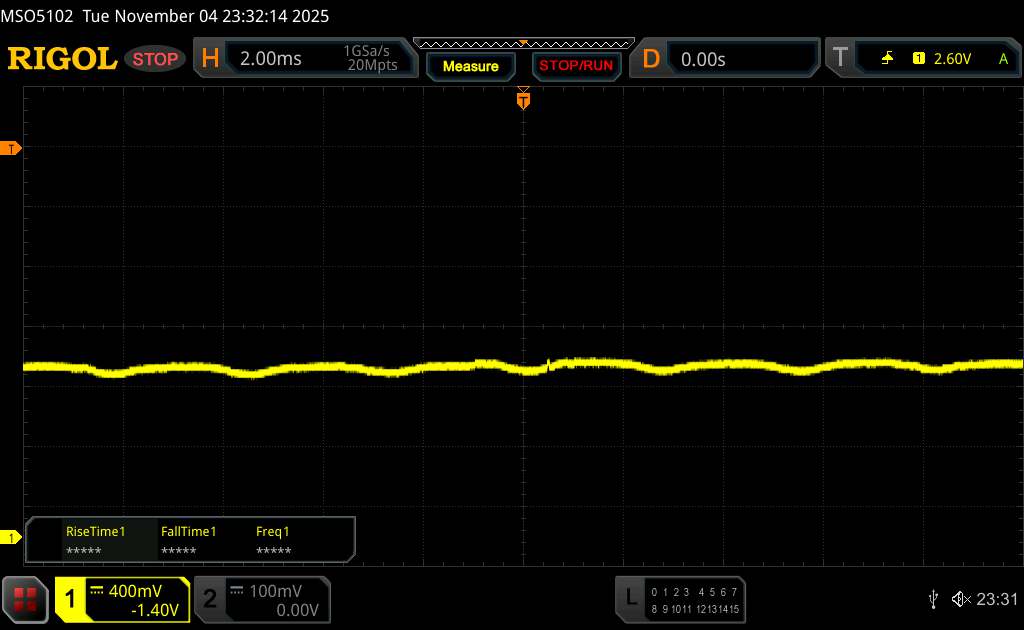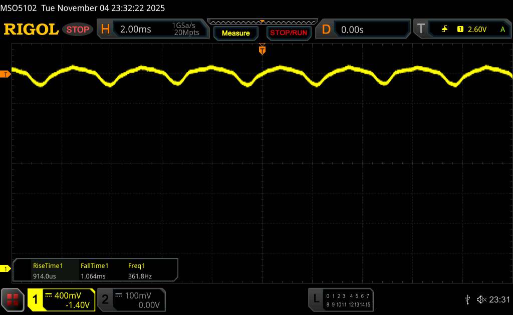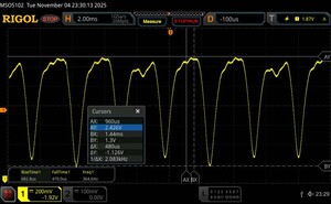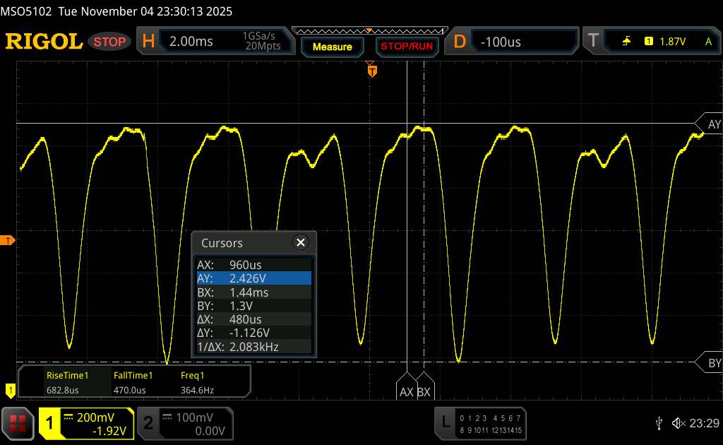 Oszcilloszkóp segítségével 360 Hz körüli alapflickert mértünk. Ezenkívül a Vivo nagyfrekvenciás PWM dimmelést használ, amelynek frekvenciája 2083 Hz, miközben a telefon kijelzőjének fényereje a minimálisra van állítva. Ez, a lapos amplitúdógörbe mellett, a legtöbb ember számára segíthet elkerülni a kellemetlenségeket, de az érzékeny egyének esetében ez sem zárható ki teljesen.