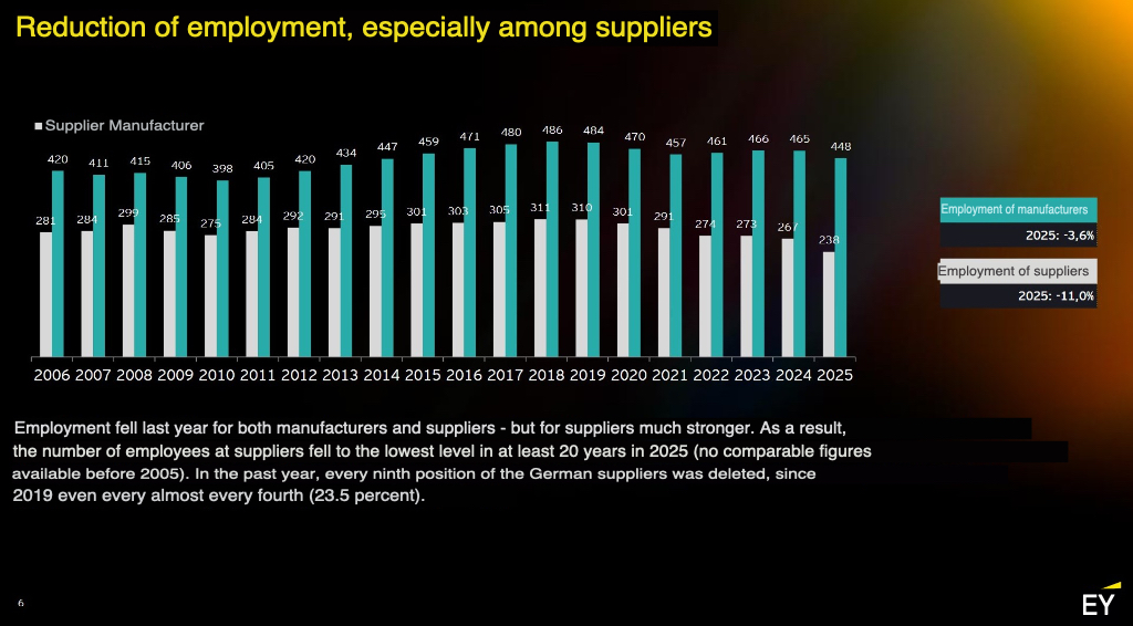 Az elemzés szerint ez a folyamatos keresletgyengülés közvetlenül érinti a németországi autógyártó telephelyeket. A járműgyártók és beszállítóik 2025-ben további 1,6 százalékos forgalomcsökkenéssel zárták az évet. A munkaerőre gyakorolt következmények azonban még ennél is súlyosabbak. Az autóipar a munkahelyek 6,2 százalékát szüntette meg, ami a teljes foglalkoztatottságot 14 éve a legalacsonyabb szintre, mintegy 725 ezer főre szorította.