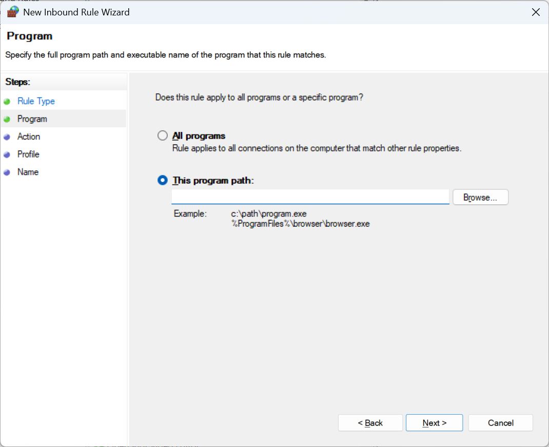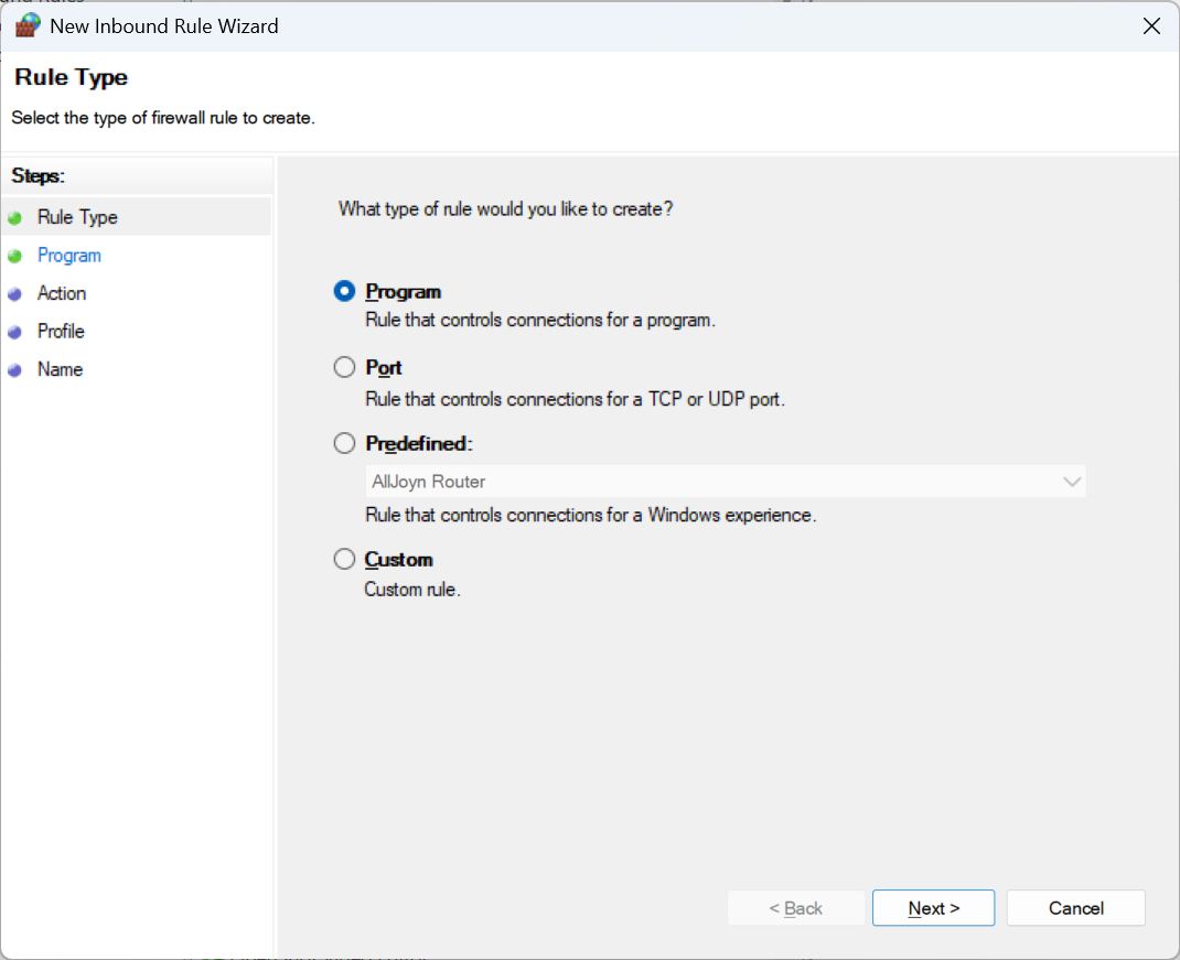 - Kattintson a Bejövő szabályok → Új szabály → Program menüpontra