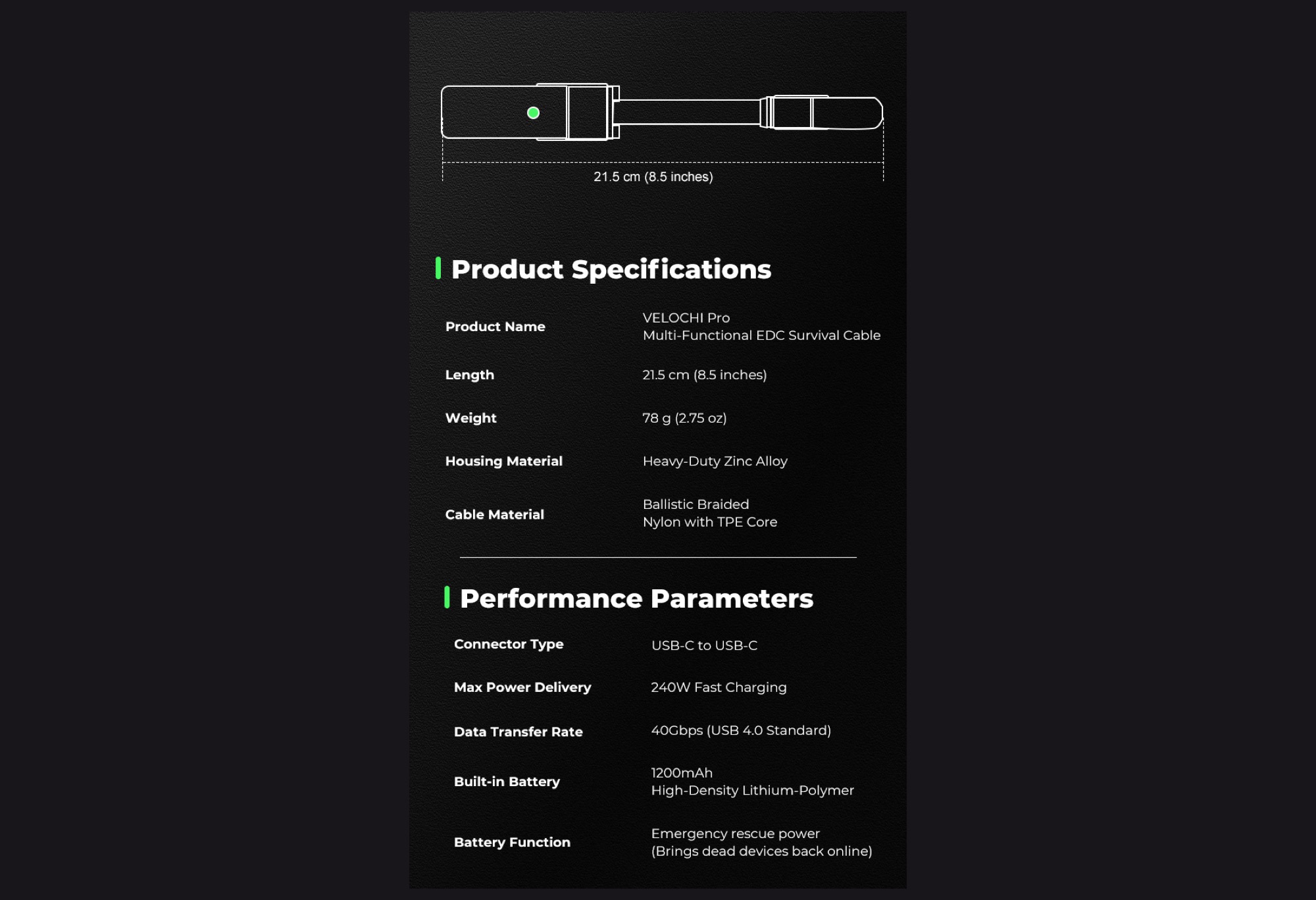 A Velochi Pro-t a technológia szerelmeseinek szánt, mindennapos hordozható (EDC) szerkentyűként forgalmazzák. Míg sok EDC eszköz olyan eszközöket kombinál, mint a kés, a csavarhúzó vagy a csomagnyitó, a Velochi Pro szíve egy USB-C-ről USB-C-re csatlakozó kábel, amely akár 40 Gbit/s adatátviteli sebességet is elér, és akár 240 wattal is képes tölteni az eszközöket. A Velochi Pro így felveszi a versenyt a kiváló minőségű USB-4 kábelekkel(19,99 $ az Amazonon).
