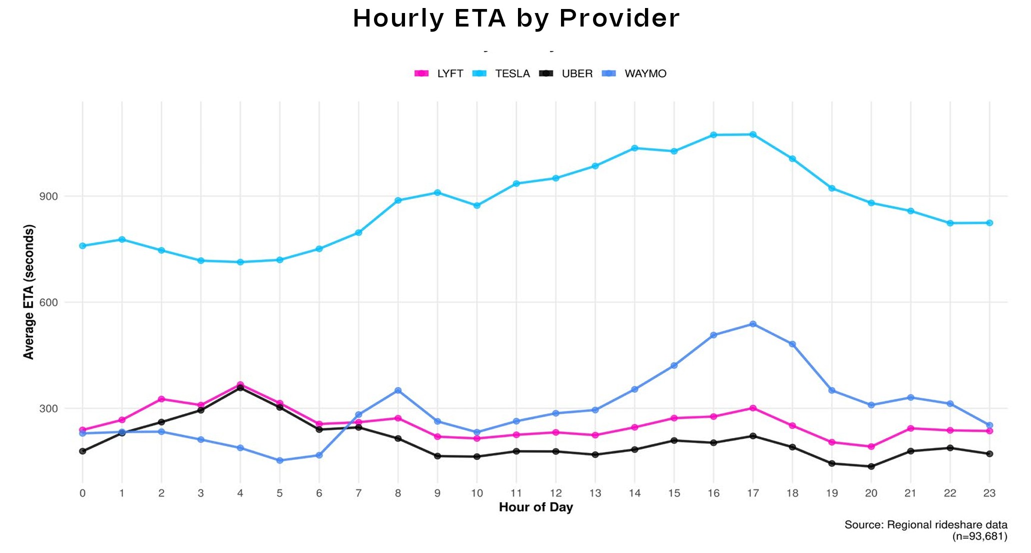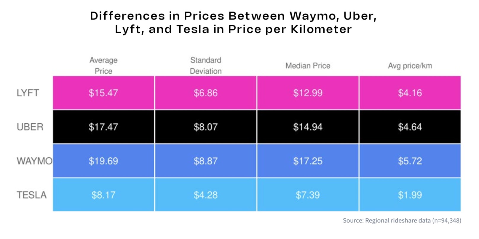 Egy átlagos fuvarmegosztási árakat vizsgáló tanulmány szerint a Tesla mindössze 1,99 dollárt kér kilométerenként (3,20 dollár/mérföld), míg a Waymo átlagára ennek közel háromszorosa. Ez 94 348 fuvar átlagából származik, ahol az adatok az utazás árát és az adott fuvarmegosztó szolgáltatás várakozási idejét is tartalmazzák.