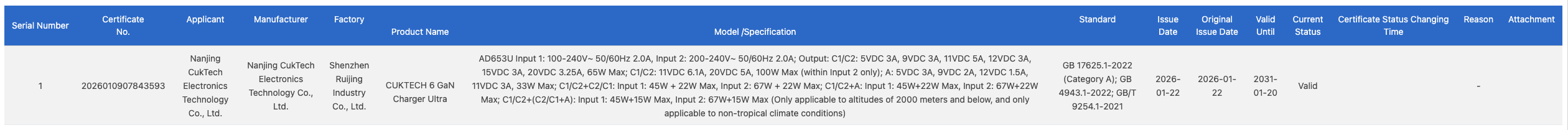 Most a Cuktech 6 GaN Charger Ultra megjelent a China Quality Certification Centre (CQC) adatbázisában. A bejegyzés azt jelzi, hogy ez a még meg nem jelent tartozék elnyerte a CCC (China Compulsory Certification) vagy 3C tanúsítványt. Ez az oldal a termék néhány jellemzőjét is feltárja.
