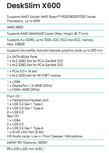Úgy tűnik, hogy az ASRock új mini PC-ket készül piacra dobni, és ezek között van az AMD-vel hajtott DeskSlim X600. A rendszer specifikációs lapja felbukkant, és ez arra utal, hogy a kompakt PC támogatni fogja az AM5-ös asztali processzorokat, kezdve a Ryzen 7000-es szériától a 9000-es vonalig.