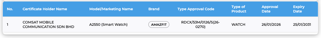 Most a malajziai szabványügyi és ipari kutatóintézet (SIRIM) adatbázisában ( ) megjelent egy bejegyzés arra utal, hogy egy másik Amazfit okosóra is közeledik a bevezetéshez. Az A2550 (Smart Watch) modellként hivatkozott készüléket a Comsat Mobile Communications Sdn Bhd jegyezte be; ez a cég az Amazfit márka tulajdonosa. Azon kívül, hogy a készülék január 26-án megkapta a megfelelő tanúsítványt, további részletek nem állnak rendelkezésre a termékről.