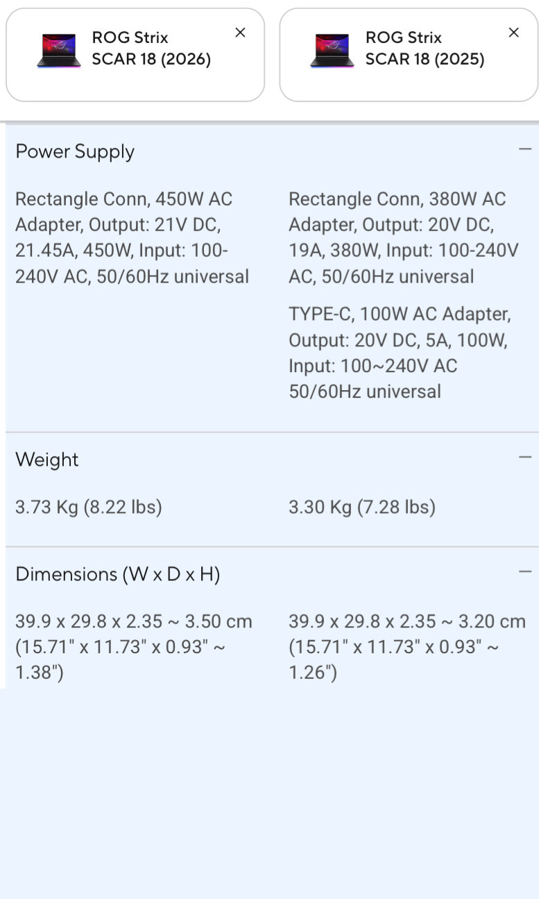 Egyrészt a kiszivárgott információk szerint a ROG Strix Scar 18 (2026) akár 450 W-ot is felvehet egy új hálózati adapteren keresztül. Az új hálózati adapter továbbra is négyszögletes csatlakozó, de a hírek szerint az új Strix Scar 18 az elődjével ellentétben teljesen kinyújtja a lábát'. Az összehasonlító kép azt is kiemeli, hogy a 2026-os modell 430 grammal többet nyom, mint elődje. Így valószínűsíthető, hogy az Asus egy erősebb hűtési megoldást is beszerelt, bár a tavalyi modell tesztelésekor nem találkoztunk problémákkal.