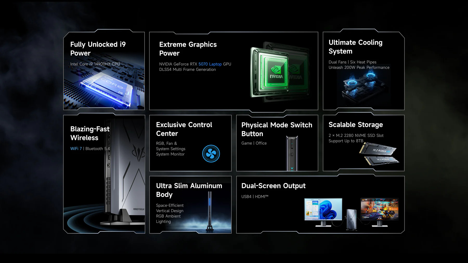 Ezen kívül az AtomMan G7 Pro csak a következő eszközökkel konfigurálható Nvidia GeForce RTX 5070 laptop GPU-val, amelyet a Minisforum hat hőcsővel, kettős ventilátorral és háromoldali elszívórendszerrel hűt. Úgy tűnik, ez a hűtőrendszer lehetővé teszi, hogy az AtomMan G7 Pro akár 200 W-ot is le tudjon húzni a stressztesztek során, aktivált Game Mode mellett. Egyébként a mini-PC "Office Mode" üzemmódban legfeljebb 150 W-ot fogyaszt.
