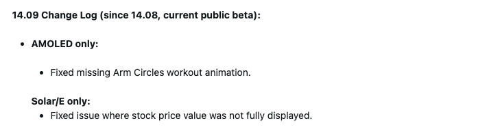 A 14.09-es béta verzió új kiadása viszonylag kisebb jelentőségű, két hibajavítást hoz az Instinct 3 és a kapcsolódó okosórák felhasználói számára. Az Instinct 3 AMOLED esetében a Garmin hozzáadta a korábban hiányzó Arm Circles edzésanimációt. Csak az Instinct 3 Solar és az Instinct E okosórákhoz kapcsolódik egy hibajavítás az új Stocks Glance-hoz. Megoldódott egy probléma, amely miatt a részvények árfolyamértéke csak részben jelenhetett meg.