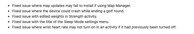 Mindezeken felül javítás történt az Alvó üzemmód beállításai menü címével kapcsolatban is. Emellett a Garmin megoldotta azt a problémát, amikor a csuklós pulzusszám-felvétel nem indult el automatikusan, ha az előzőleg ki volt kapcsolva egy adott tevékenységhez.