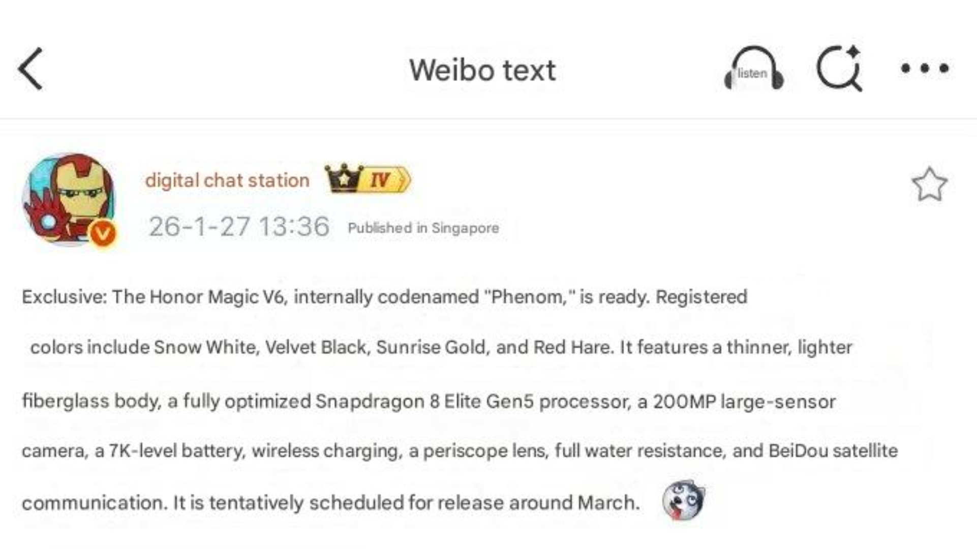 A Digital Chat Station szerint a Honor a Magic V6-ot négy színben tervezi kínálni, amelyeket Red Rabbit, Snow White, Sunrise Gold és Velvet Black néven írnak le. Azt azonban még nem tudni, hogy a Honor ezeket a színeket globálisan elérhetővé teszi-e majd. Ezt félretéve a szivárogtató azt is összefoglalja, hogy a Magic V6 a következő hardveres kiemelésekkel fog megjelenni a hazai piacon: