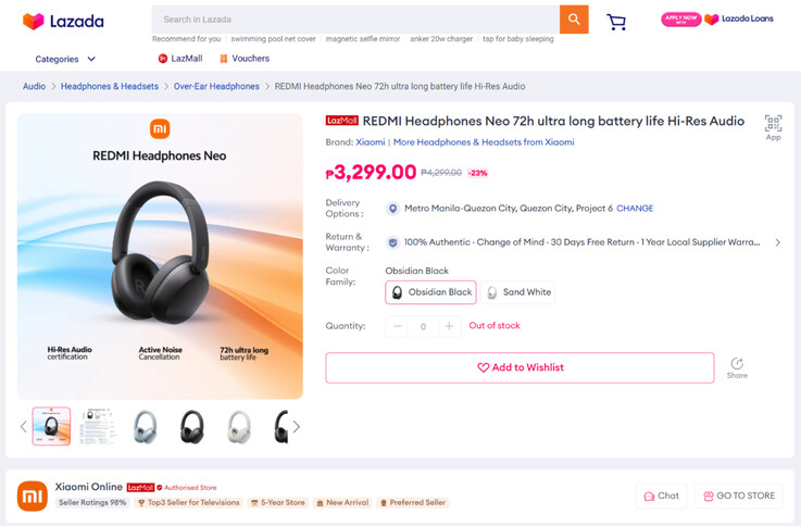 A Xiaomi kezdetben Obsidian Black és Sand White színekben fogja kiadni a Redmi Headphones Neo-t. Ahogy az alábbi képek is mutatják, a Lazada a Redmi Headphones Neo árát a Fülöp-szigeteken 3299 PHP (~55 dollár) áron kínálja, ami a 4299 PHP-ról (~70 dollár) le van árazva. Eközben a Diglex Electronics 36,70 dollárért listázta ugyanezt a fejhallgatót, de minimum 100 darabos rendelési mennyiséggel.